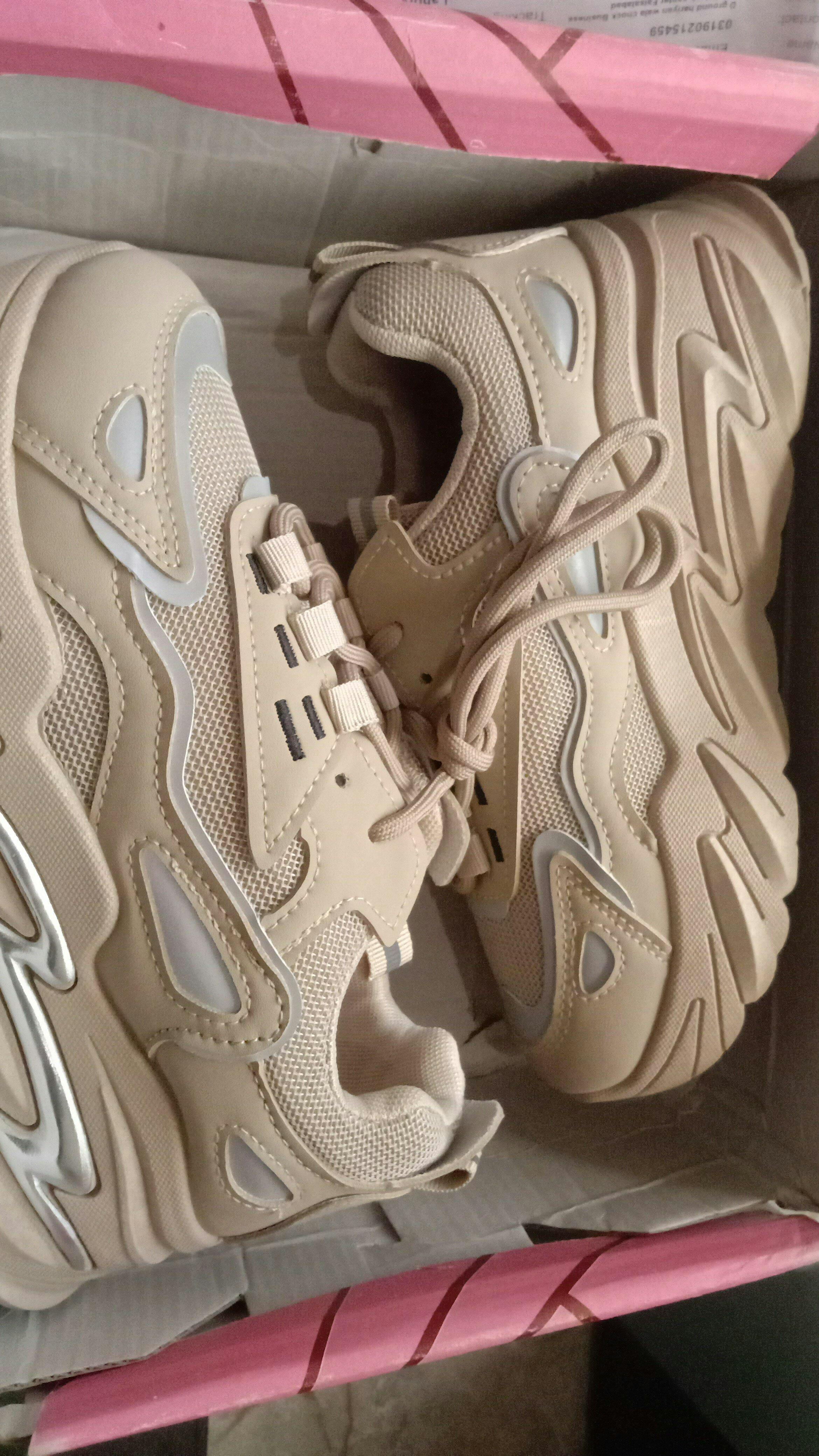 Women's Monochromatic Beige Chunky Sneaker | Tan Metallic Platform Trainer - This trendy, aggressive sneaker features a uniform tan/nude upper with mesh and synthetic overlays. The chunky platform sole is highlighted by a striking metallic silver lightning bolt detail, perfect for bold streetwear looks.