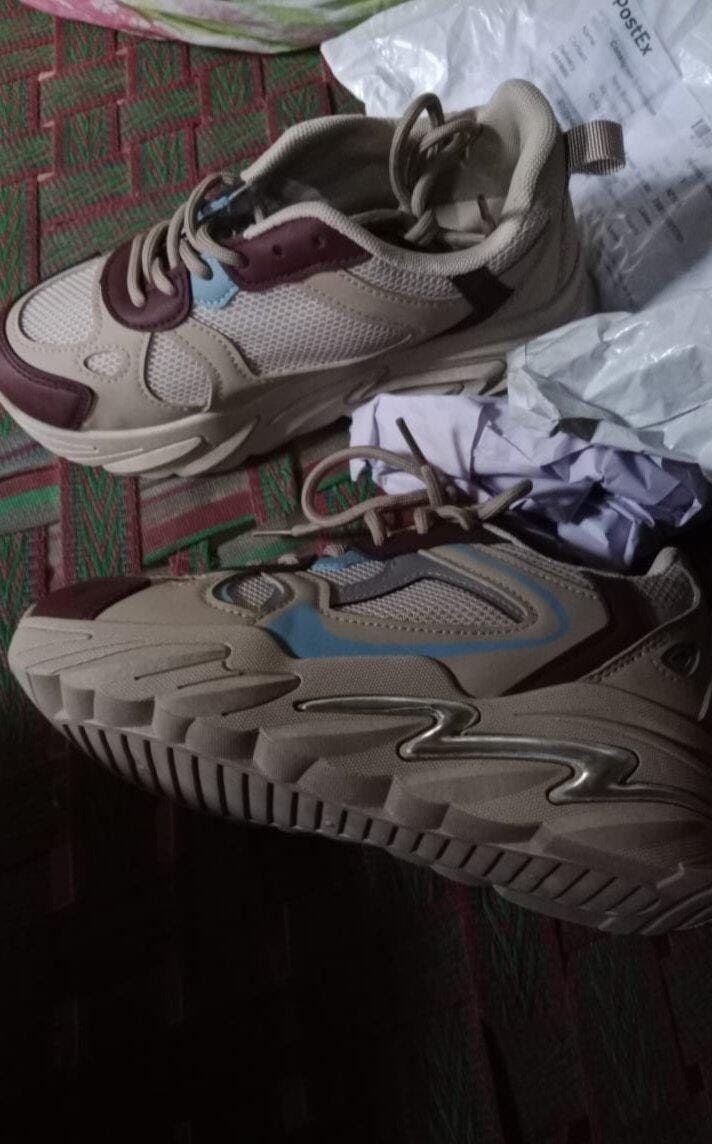 Women's Tan Multi-Color Chunky Trainer | Burgundy & Blue Fashion Sneaker - This bold, Y2K-style sneaker features a mixed-material upper in neutral tan, deep burgundy, and bright blue accents. Finished with an aggressive sole and a striking metallic silver lightning bolt detail for ultimate streetwear style.