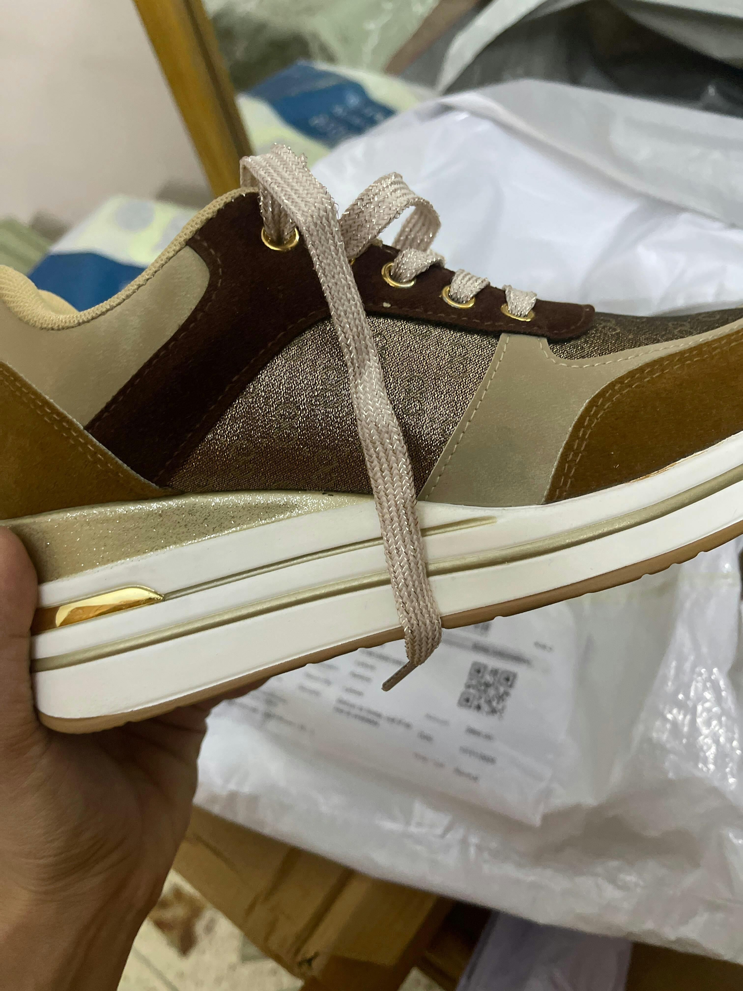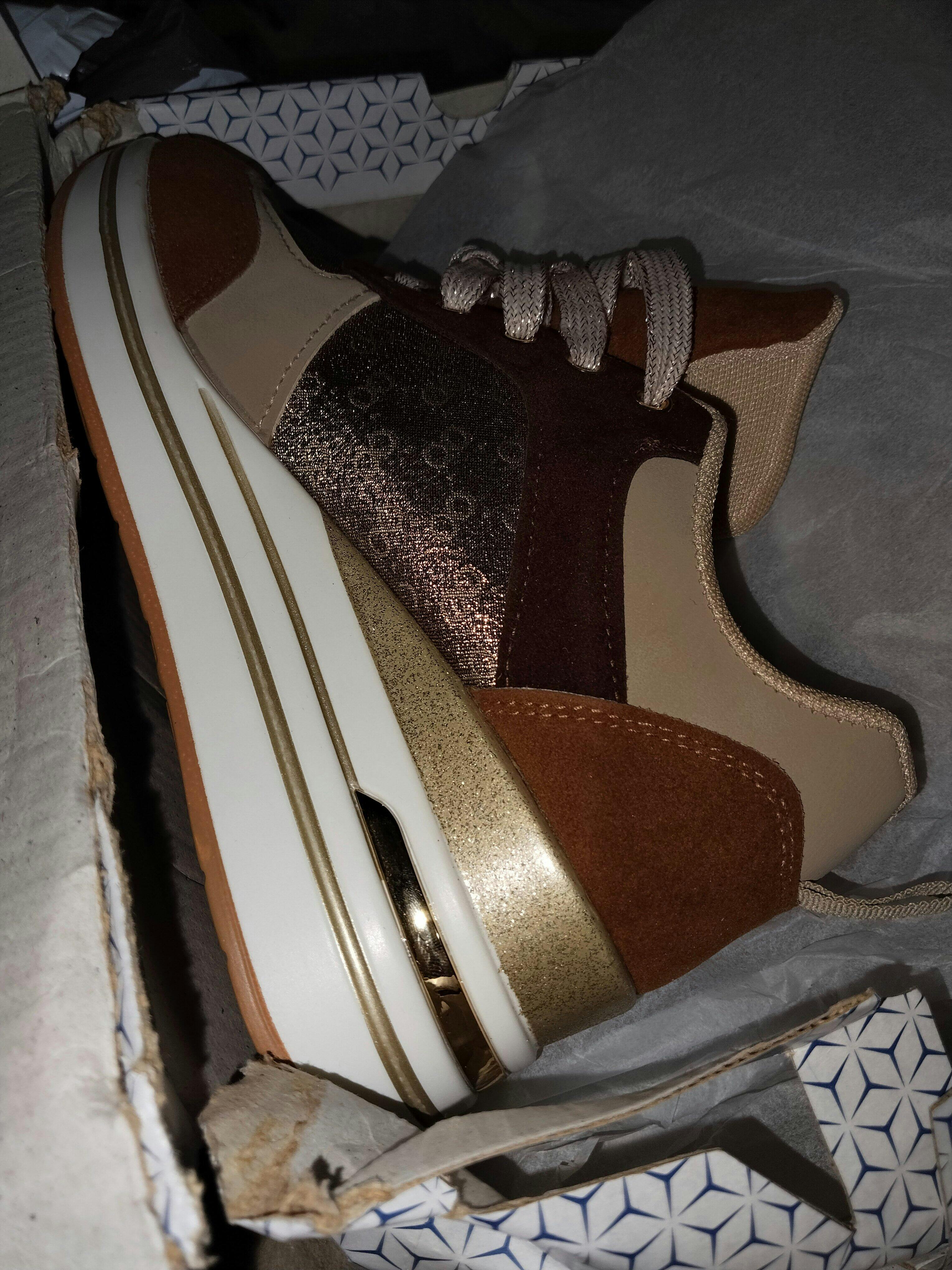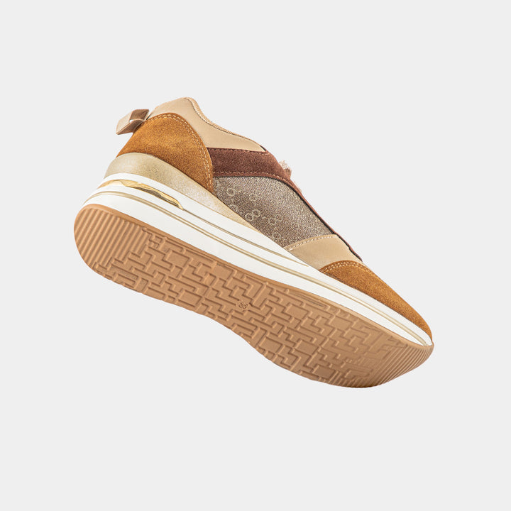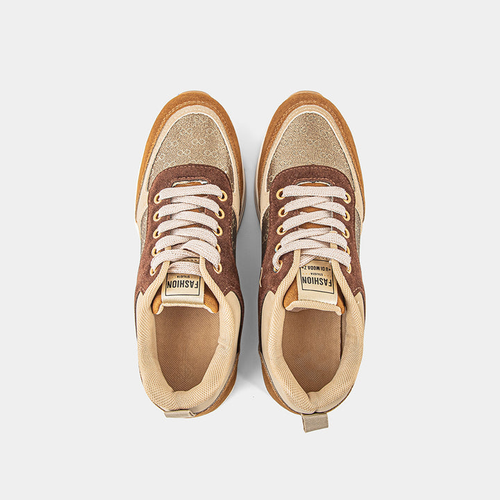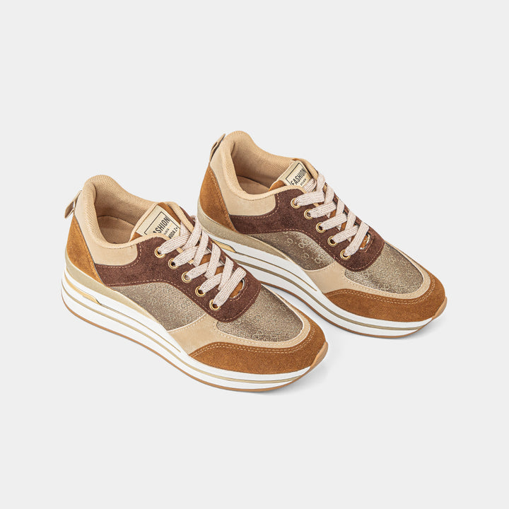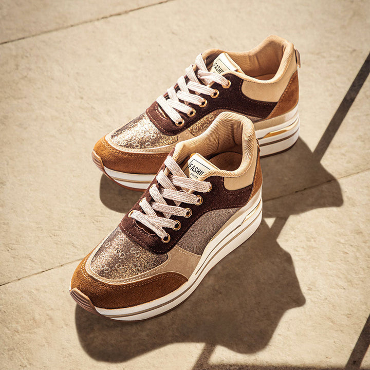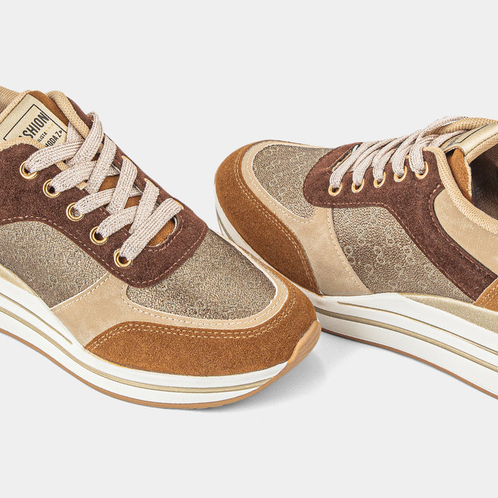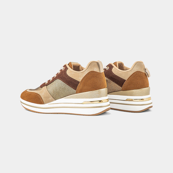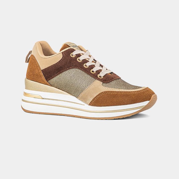 Elevate your footwear game with our stunning Multi-Tone Neutral Wedge Sneakers for women, a perfect blend of sophisticated style and elevated comfort. These chic and versatile sneakers are designed for the fashion-conscious individual who desires a touch of height without sacrificing ease of wear. The shoe features a beautiful combination of rich brown and beige suede-like panels, contrasted with a sparkling bronze or gold glitter textile on the sides, creating a dynamic and luxurious visual appeal. The hidden wedge heel provides a flattering lift, while the chunky white platform sole ensures a stable and cushioned step, making them perfect for all-day comfort. Complete with coordinating beige laces and a durable gum rubber outsole for reliable traction, these wedge sneakers are ideal for pairing with jeans, dresses, or skirts to add a stylish and contemporary finish to any casual or smart-casual ensemble. Embrace the perfect fusion of trendy design and practical elegance with these must-have trainers that will become a staple in your wardrobe.