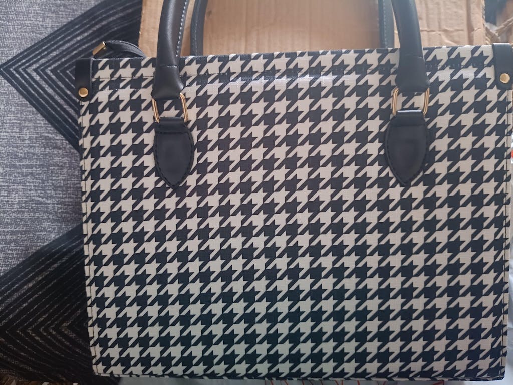 Elevate your style with our classic Houndstooth Tote Bag, a timeless and sophisticated accessory designed for the modern individual who appreciates chic elegance and practical functionality. This iconic black and white houndstooth pattern provides a striking visual appeal that effortlessly complements both professional and casual ensembles, making it a versatile statement piece for any occasion. Crafted with high-quality, durable fabric, this spacious bag is built to last and comfortably holds all your daily essentials, while the contrasting sleek black leather handles and accents provide a polished finish and comfortable carry. Perfect for adding a touch of classic sophistication to your work attire, a stylish companion for urban outings, or a refined accent for your weekend adventures, this versatile tote bag with its enduring design and robust construction is more than just an accessory—it's a nod to timeless fashion and everyday utility.