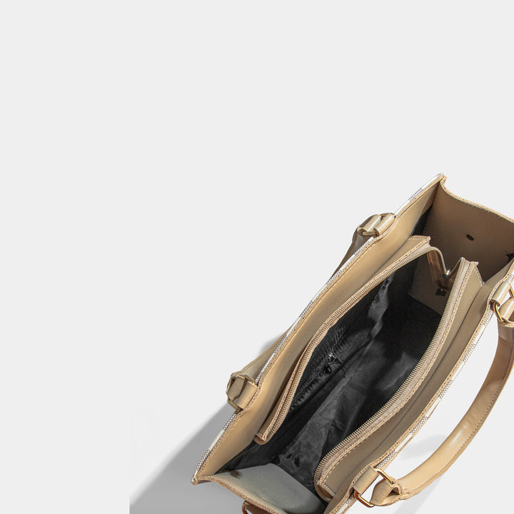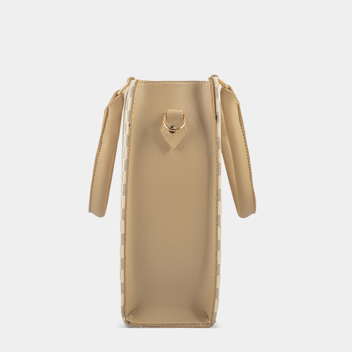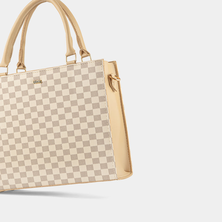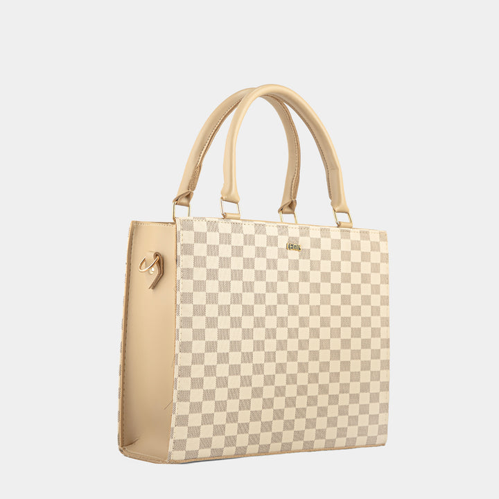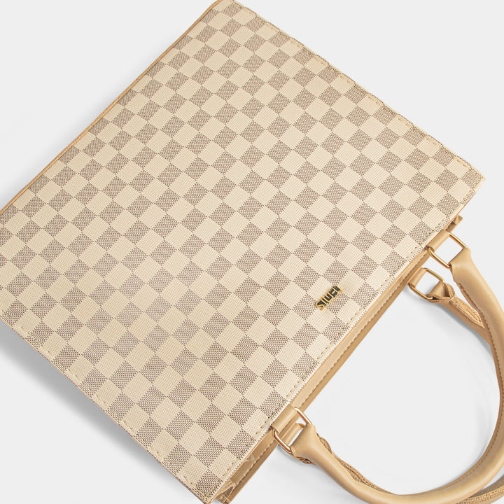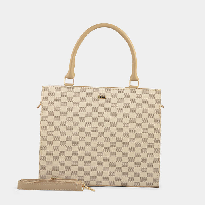 Elevate your style with this classic beige checked tote bag. Crafted from durable raxine, this versatile accessory offers both fashion and function. The spacious, square-shaped interior includes a secure zippered pocket, making it perfect for carrying your daily essentials. With both top handles and an adjustable long strap, it's a stylish and practical choice for any occasion.