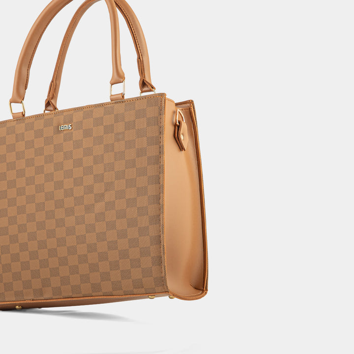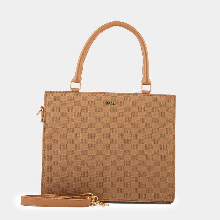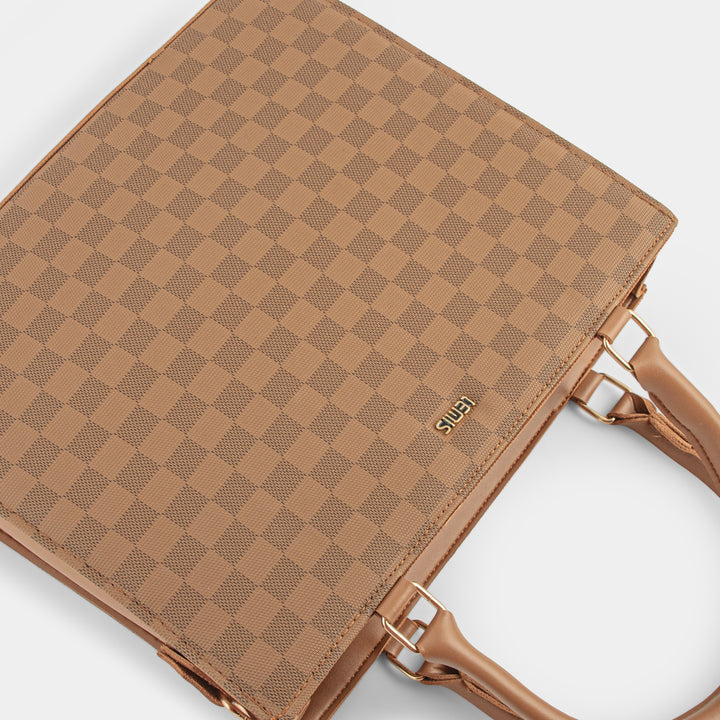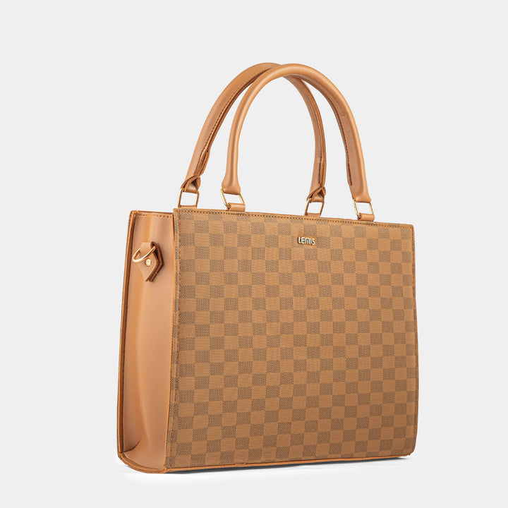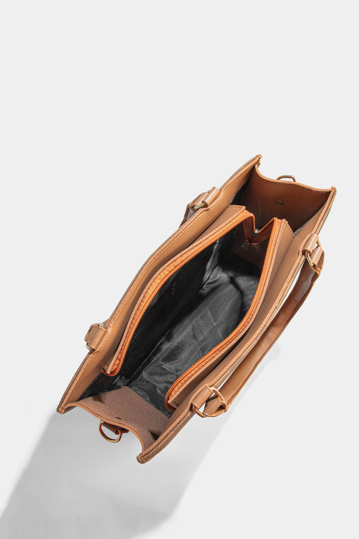 This elegant off-white tote bag is a sophisticated addition to any wardrobe. Crafted with a structured silhouette, it maintains its shape, offering a polished and professional look. The bag features distinctive top handles and a unique front strap with a gold-tone clasp, adding a touch of modern luxury. Spacious and versatile, it's perfect for carrying your daily essentials from the office to a casual outing.