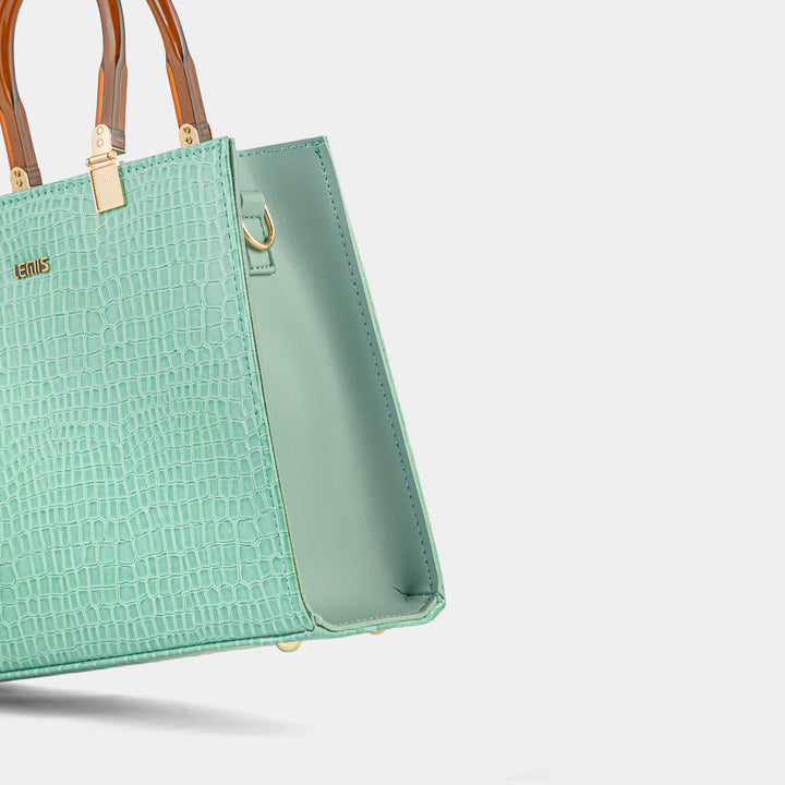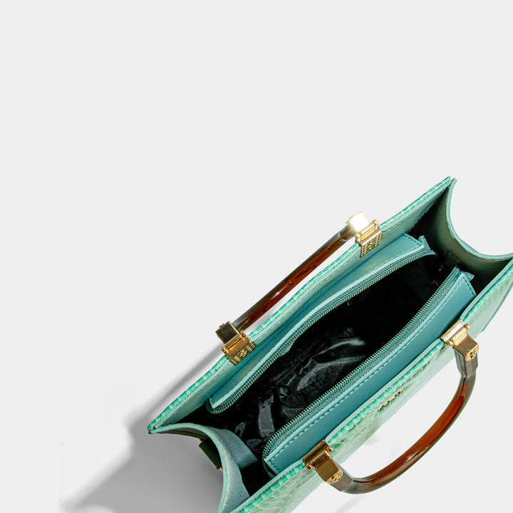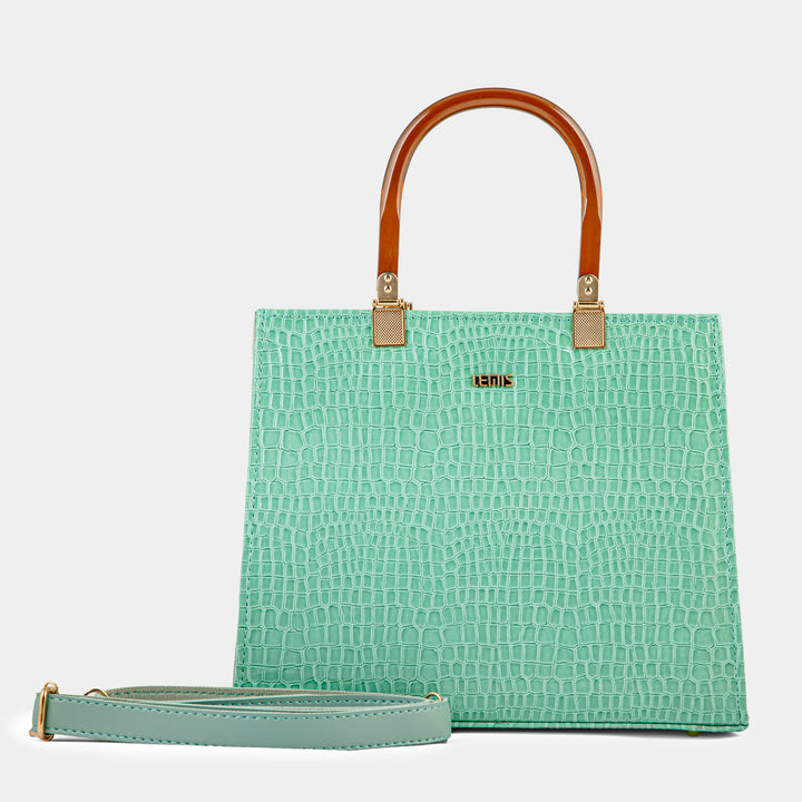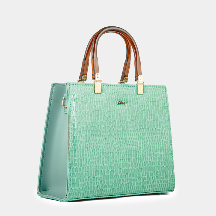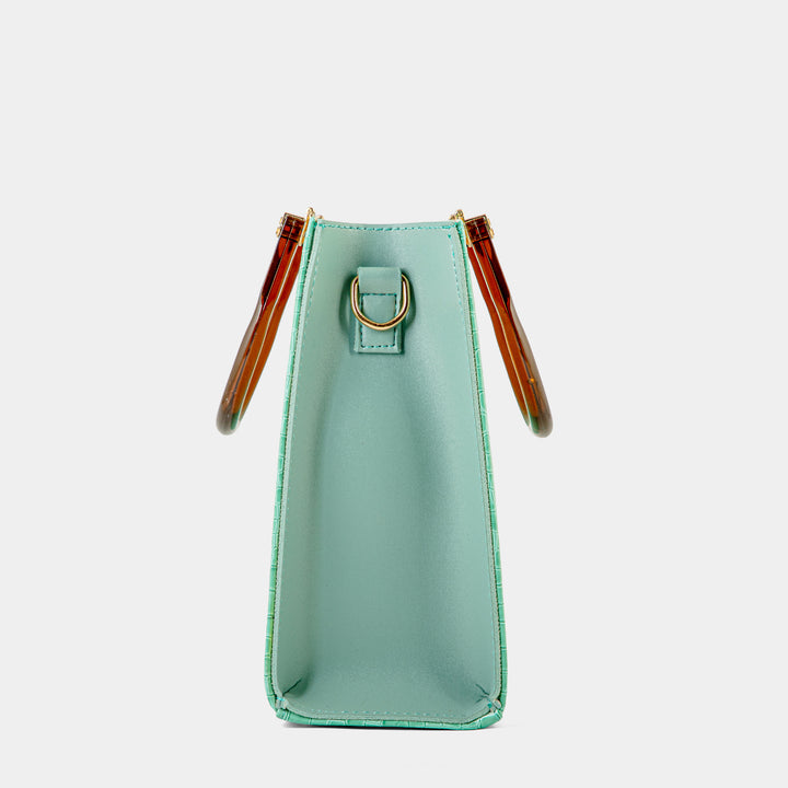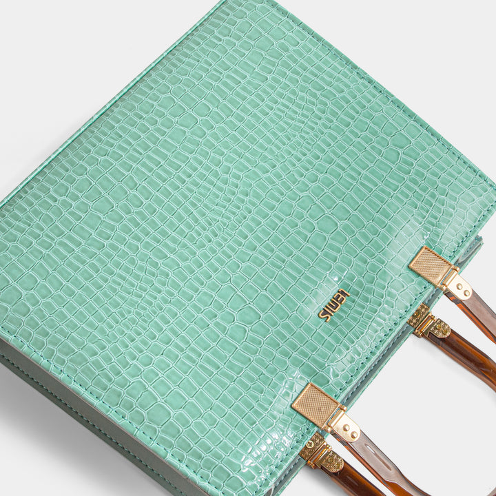 This stunning tote bag features a unique mint green crocodile-embossed finish, offering a touch of exotic elegance. The chunky tortoiseshell handles provide a stylish contrast, while gold-toned hardware adds a polished, luxurious feel. Perfect for a chic daytime look, this bag effortlessly combines classic texture with a modern silhouette.