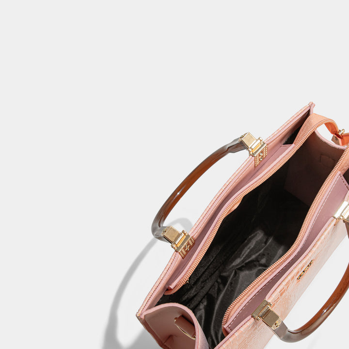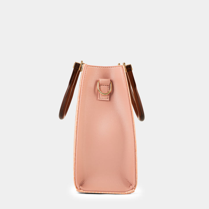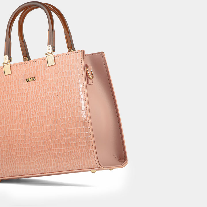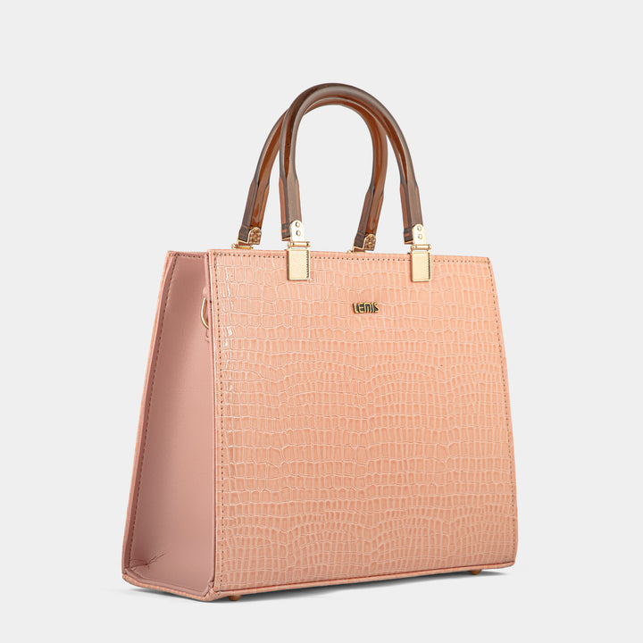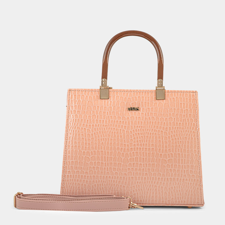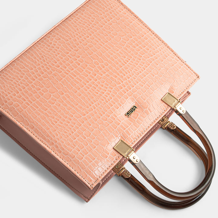 This stunning tote bag, perfect for any occasion in Pakistan, features a beautiful light pink, crocodile-embossed texture that exudes elegance. The classic tortoiseshell handles add a sophisticated flair, while the polished gold hardware provides a touch of luxury. This structured bag is both spacious and stylish, making it an ideal choice for a day out or a special event.