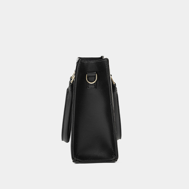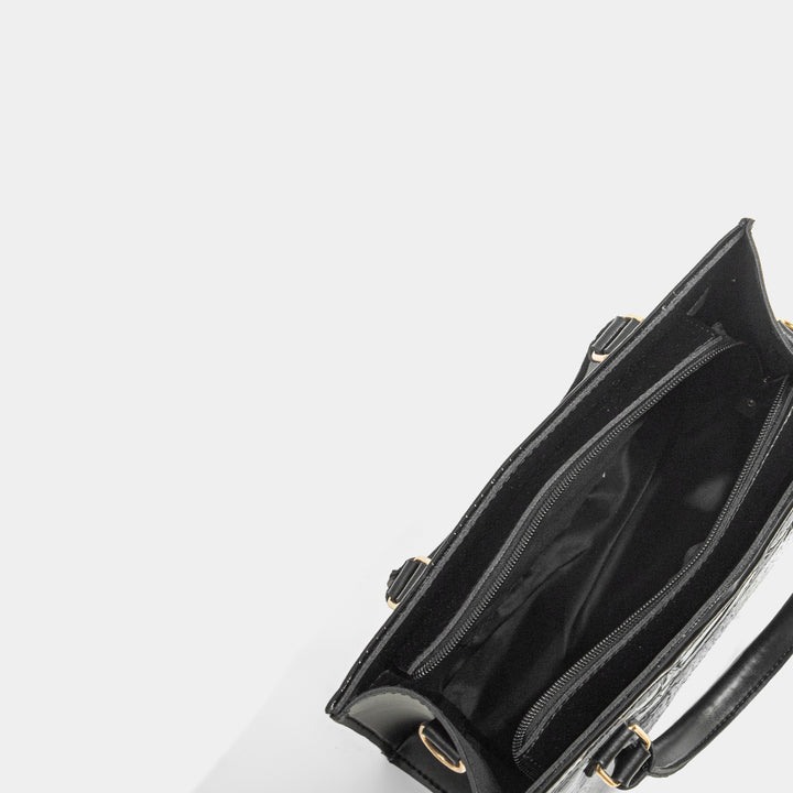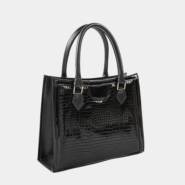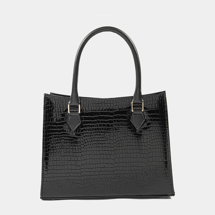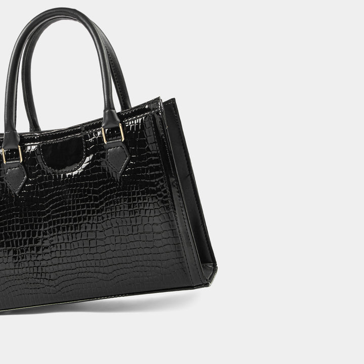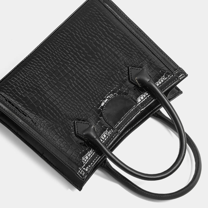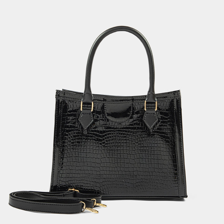 Patent Black Croc-Embossed Structured Handbag | Women's Glossy Tote - Achieve a high-fashion look with this shiny black, crocodile-effect bag. It features a sharp, structured silhouette, sleek top handles, and a detachable long strap for versatile styling.