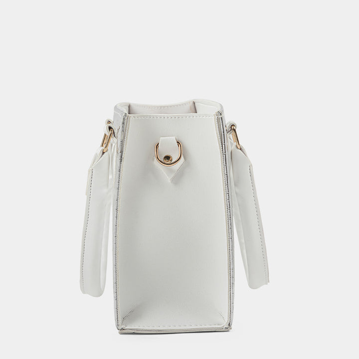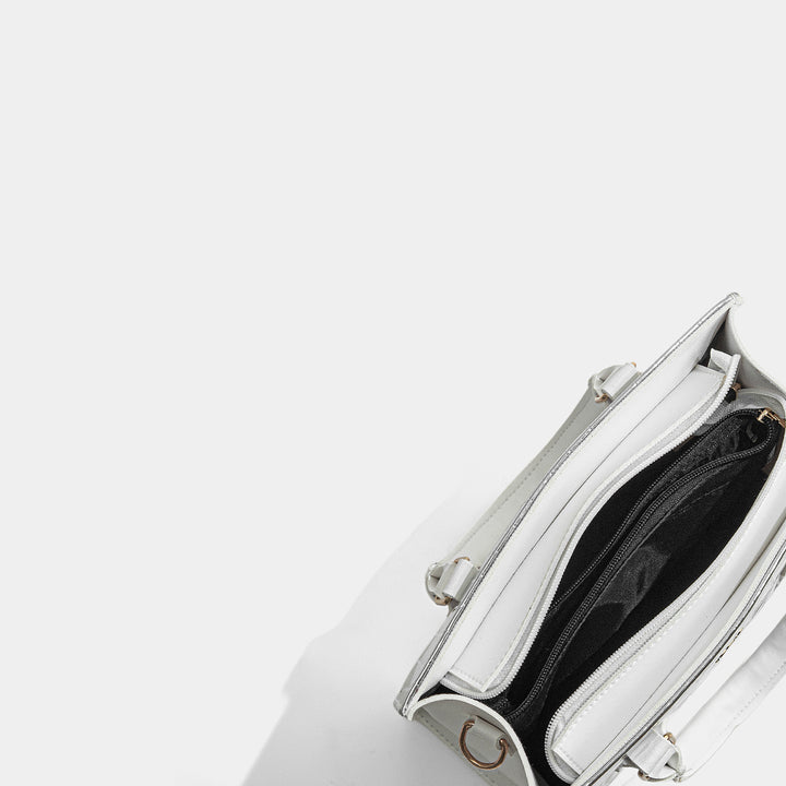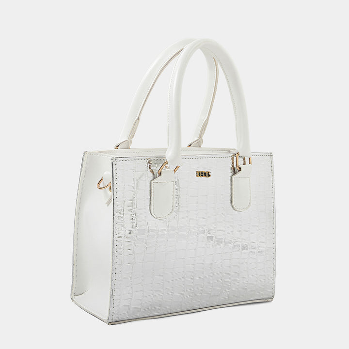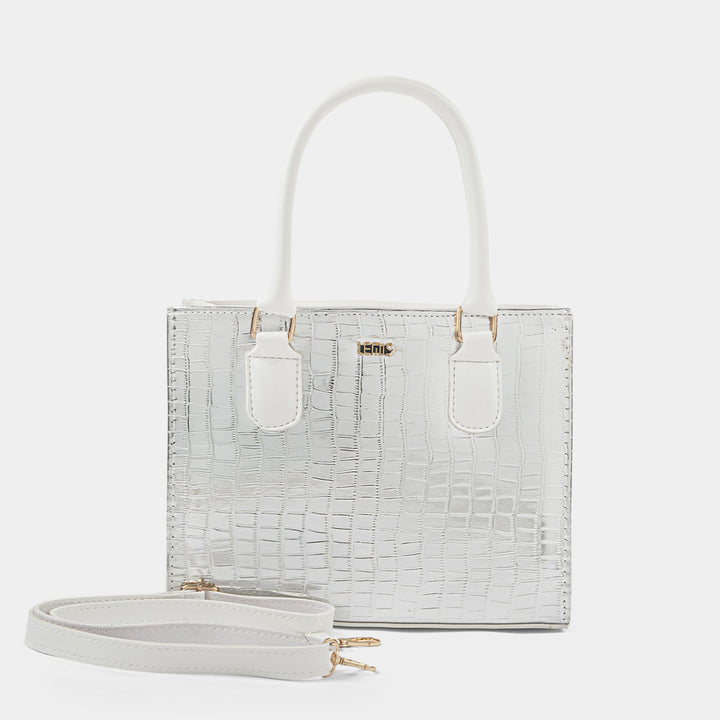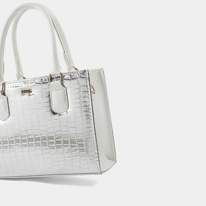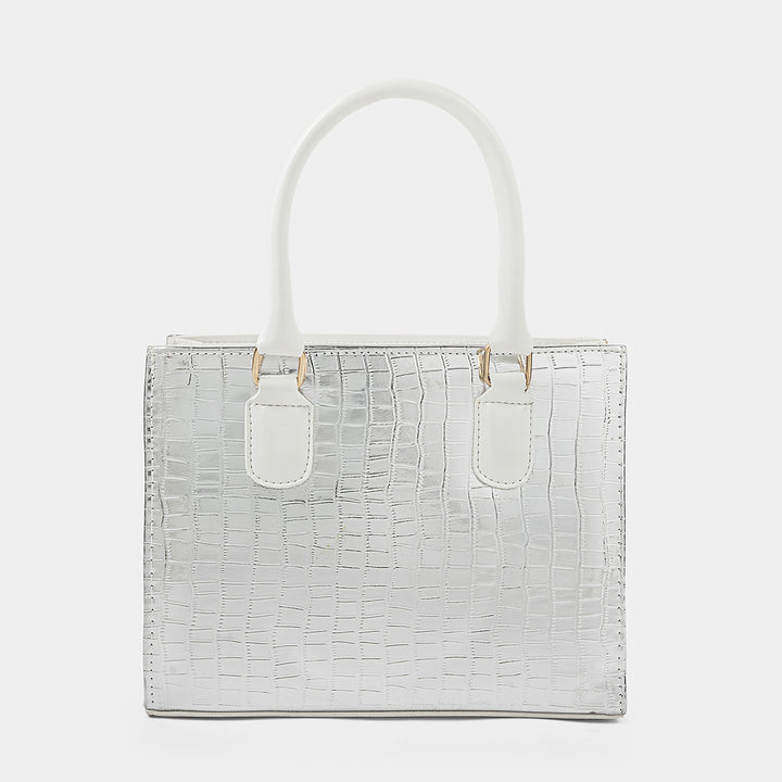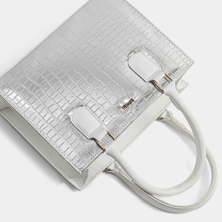 Metallic Silver Croc-Embossed Handbag | Women's Square Tote - This stunning, structured bag features a high-shine silver crocodile texture, contrasting white top handles, and a versatile detachable long strap. Perfect for making a bold fashion statement.