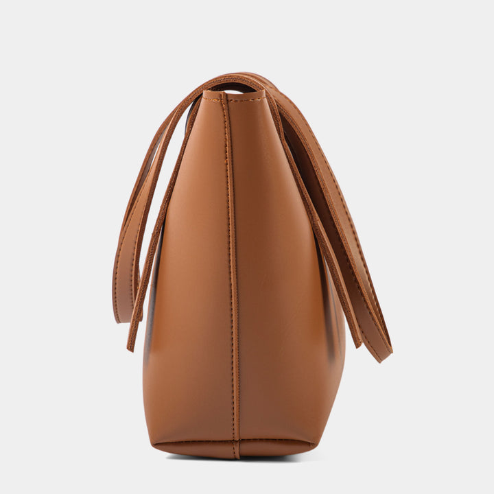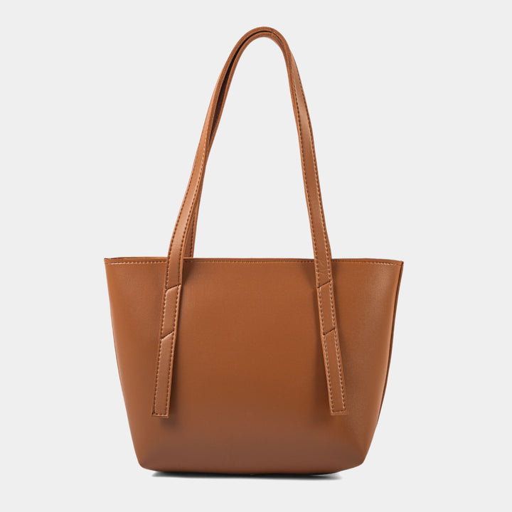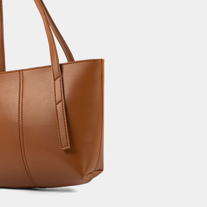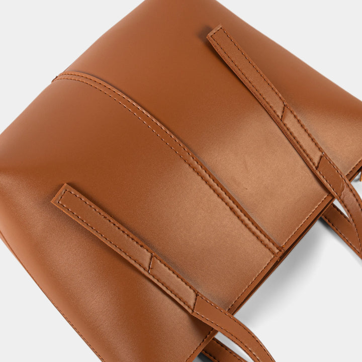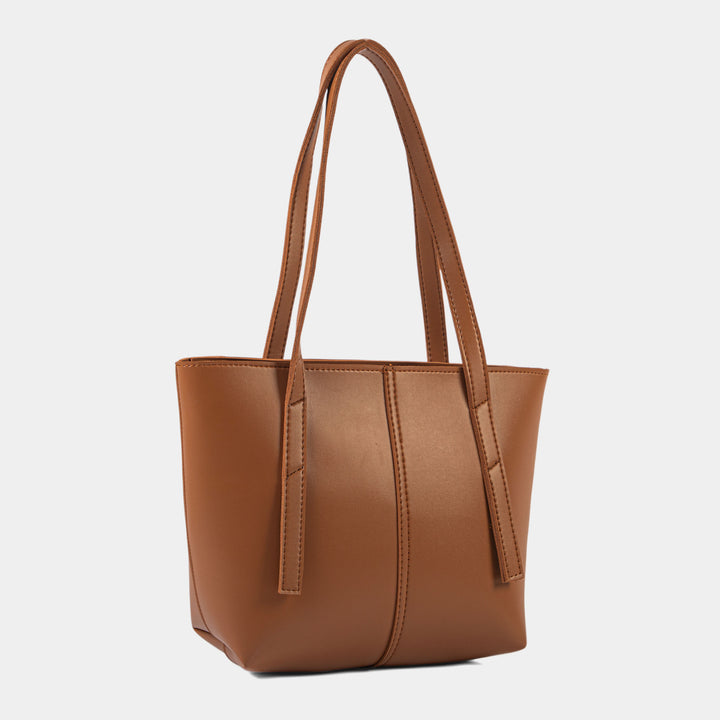 Embrace timeless style with this beautifully structured, minimalist tan shoulder tote bag. Its rich, warm brown tone provides an incredibly versatile hue that complements any outfit, transitioning effortlessly across seasons. Crafted from smooth faux leather, the design features a clean, simple silhouette with refined stitching where the twin straps meet the main body.