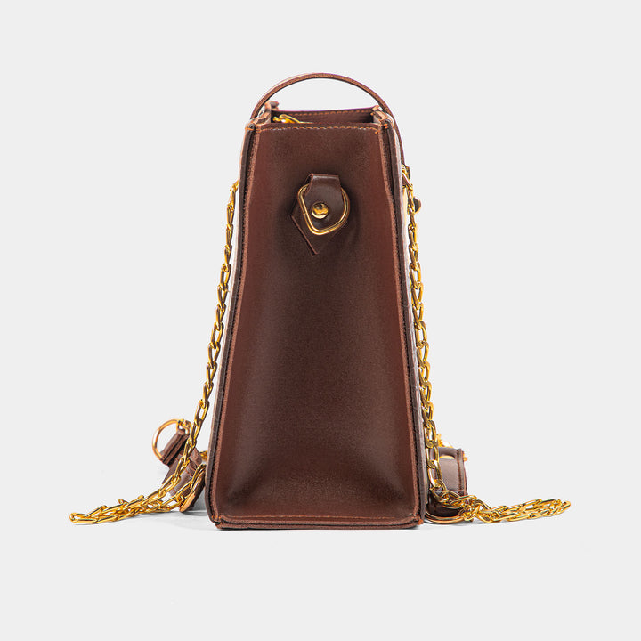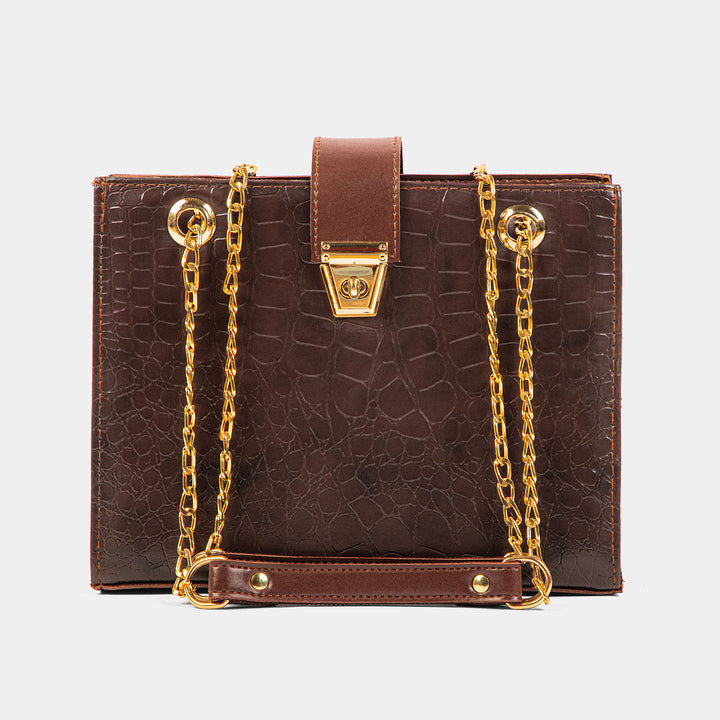 The design is beautifully accented by striking gold-tone hardware, including a glamorous double chain strap that can be worn over the shoulder or across the body, and a prominent, secure turn-lock clasp. A contrasting smooth brown leather tab provides the finishing touch to the closure. Its boxy silhouette is perfect for holding your evening essentials, making it the ideal accessory for formal events, dinners, or whenever you want to inject opulent texture into your look.