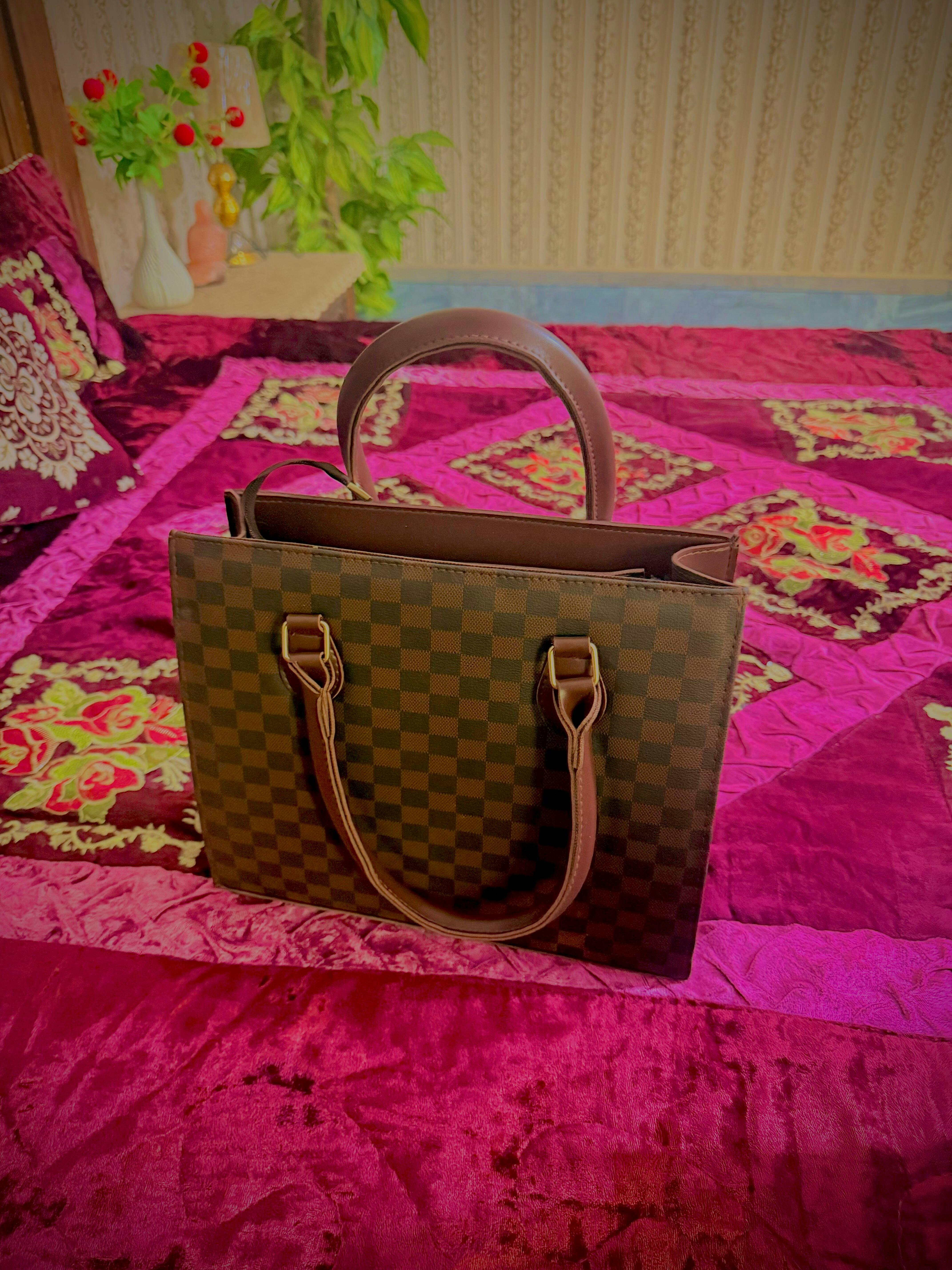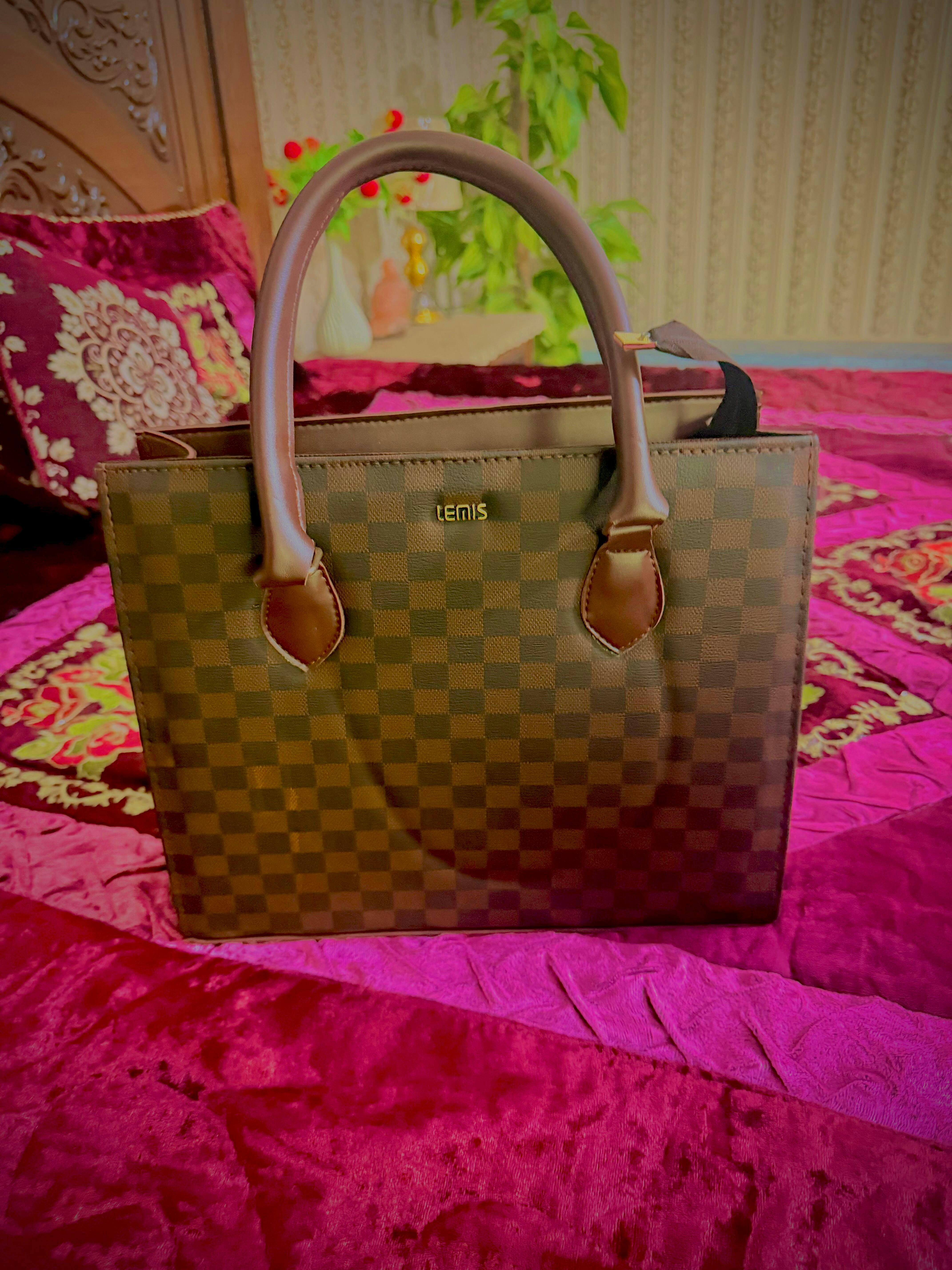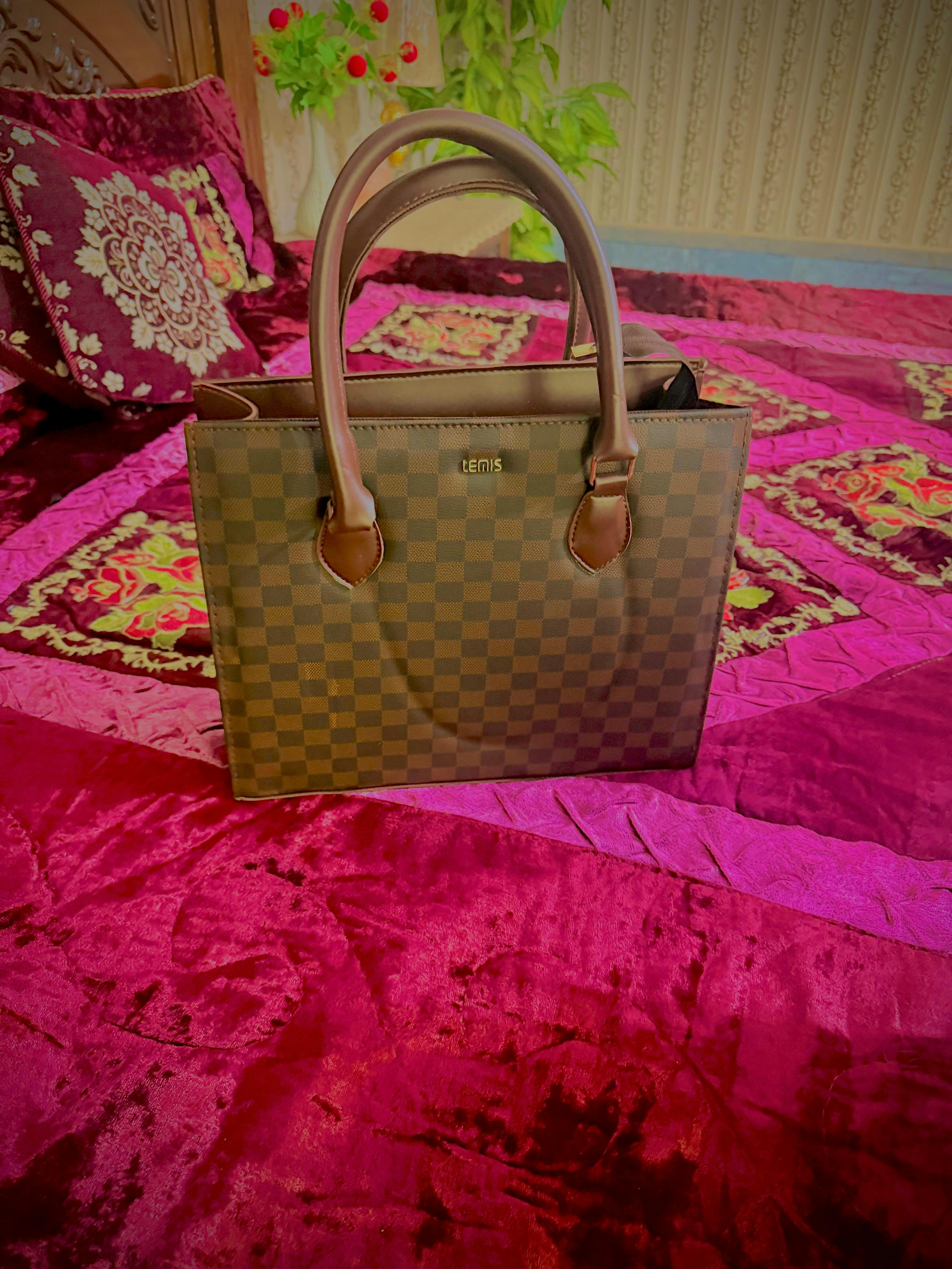 Short Description (Content) Brighten up your accessory collection with this Tan Checkered Tote Bag. Designed with a classic beige and camel grid pattern, this structured handbag offers a lighter, modern take on the traditional checkered look. It features durable top handles, a detachable crossbody strap, and the signature gold LEMIS logo for a premium finish. Spacious and stylish, it’s the perfect work-to-weekend bag for the contemporary woman.