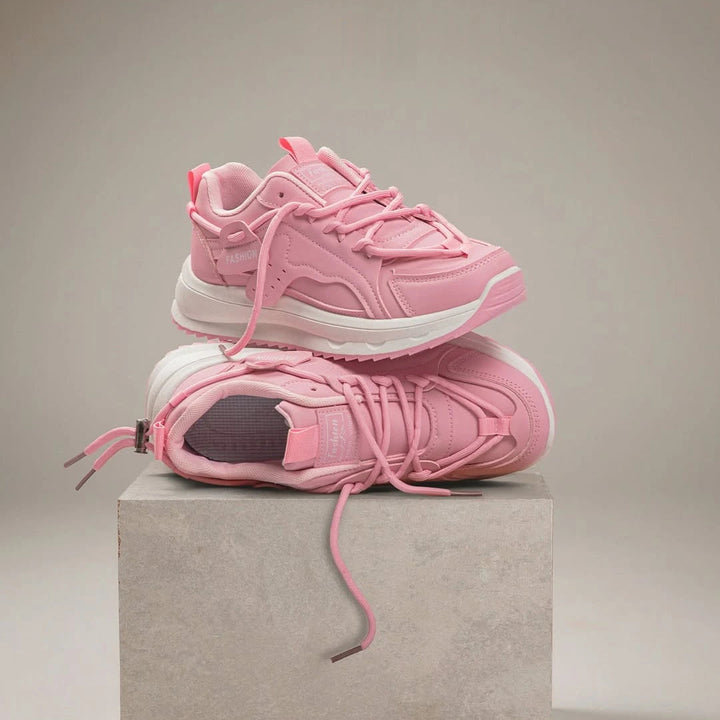 These are trendy women's sneakers featuring a soft pink upper with a stylish, layered design and thick matching laces. The shoes sit on a chunky, bright white platform sole, creating a modern and bold silhouette. They include unique details like extended lacing that wraps around the heel and a perforated flap. The overall look is a fashionable yet comfortable casual shoe, perfect for everyday wear.