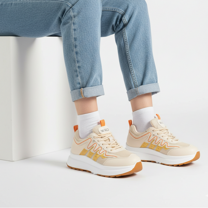 Step into contemporary style and luxurious comfort with our eye-catching Cream & Gold Chunky Sneakers for women, designed to elevate your everyday look with a touch of modern glam. These fashion-forward trainers feature a chic blend of creamy beige and off-white tones, beautifully accented with vibrant orange wavy overlays and striking metallic gold stripes, creating a dynamic and on-trend aesthetic perfect for making a statement. Crafted with a breathable mesh upper and durable synthetic leather overlays, they ensure a comfortable and secure fit, while the chunky, elevated white sole not only adds height and a contemporary silhouette but also provides exceptional cushioning and shock absorption for all-day wear. The robust brown rubber outsole offers reliable grip and durability, making these versatile cream and gold sneakers ideal for everything from streetwear fashion and casual outings to light walks and everyday activities. Embrace the chunky sneaker trend with confidence and experience the perfect fusion of distinctive design, lasting comfort, and undeniable style that will effortlessly enhance any casual or athleisure ensemble.