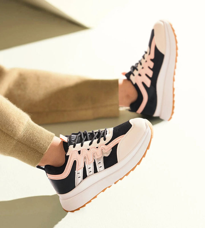 Step into bold fashion and ultimate comfort with our striking Black, White & Pink Chunky Sneakers for women, designed to elevate your streetwear game with a perfect blend of edgy style and superior cushioning. These eye-catching trainers feature a dynamic mix of black breathable mesh, crisp white and cream leather-look panels, and playful pink wavy overlays, accented with sleek silver stripes for a modern and sporty aesthetic. The chunky, elevated white midsole provides exceptional shock absorption and all-day support, while the contrasting black interior and laces add a touch of classic contrast. Finished with a durable brown rubber outsole for reliable traction, these versatile chunky sneakers are ideal for making a statement with casual outfits, adding an athletic edge to everyday wear, or comfortably navigating your urban adventures with undeniable style. Embrace the trendsetting silhouette and vibrant color palette of these must-have sneakers that effortlessly combine comfort, durability, and contemporary flair.