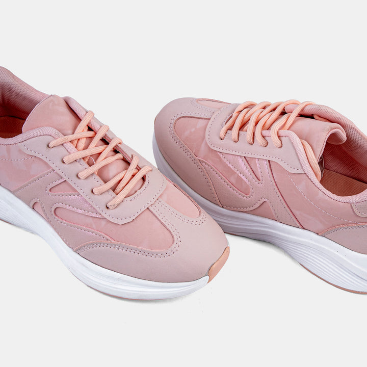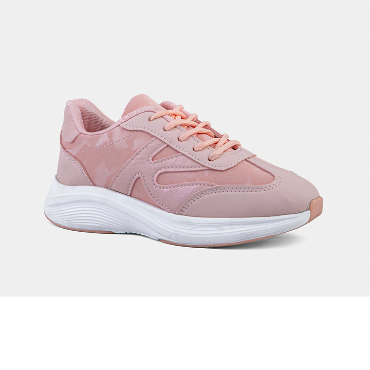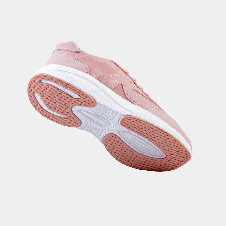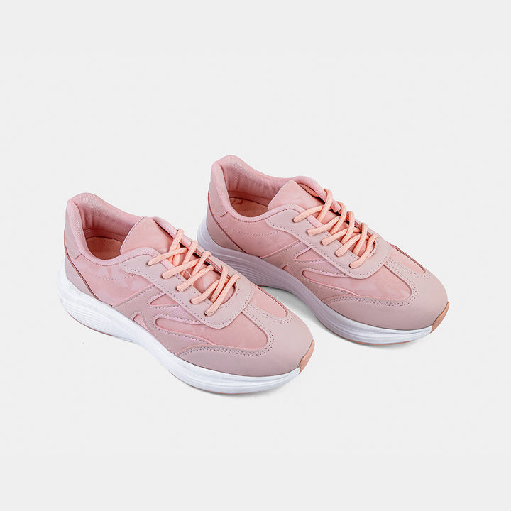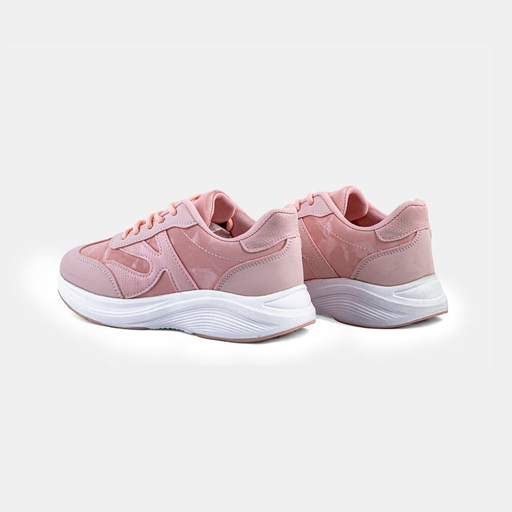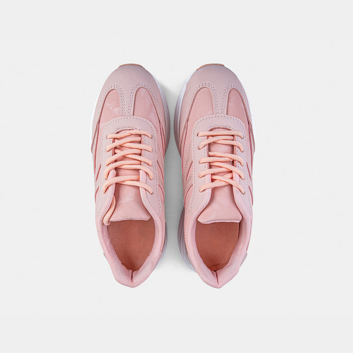 These pink fashion sneakers are designed to make a statement. Featuring a beautiful multi-paneled upper, the shoe combines soft matte sections with a subtle, glossy finish for a unique and eye-catching texture. The lightweight white sole adds a sporty contrast, creating a modern, chic aesthetic that's perfect for both casual wear and stepping up your athleisure game.