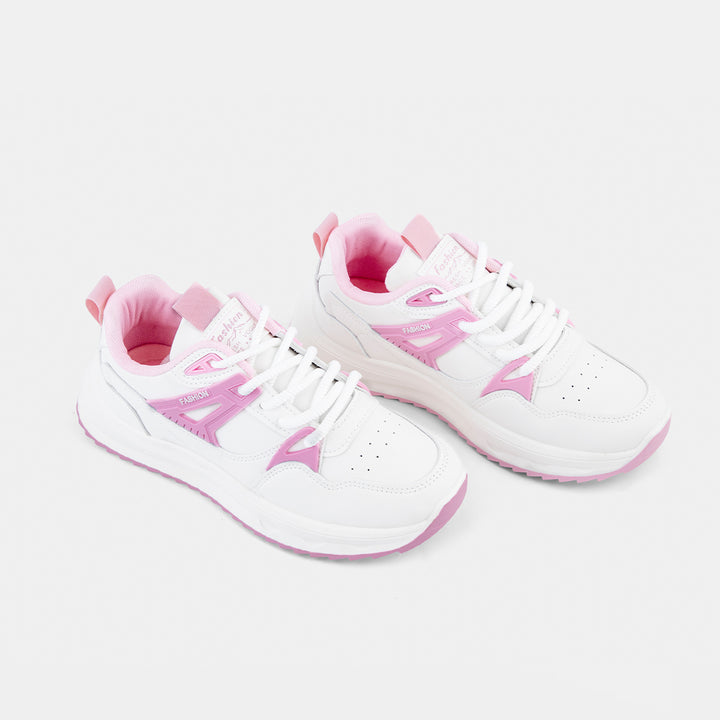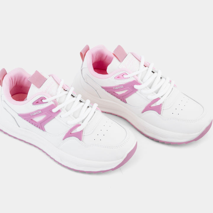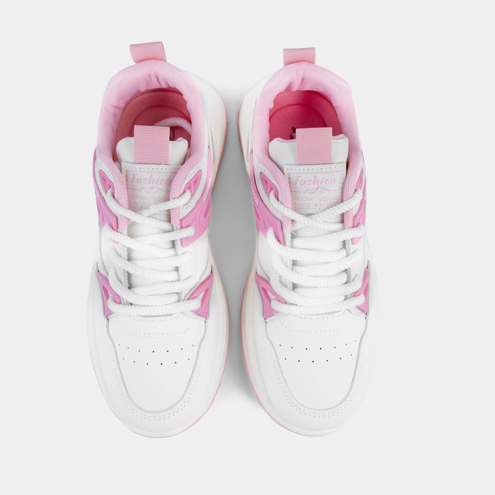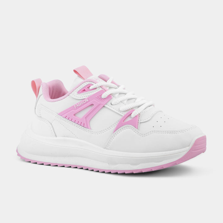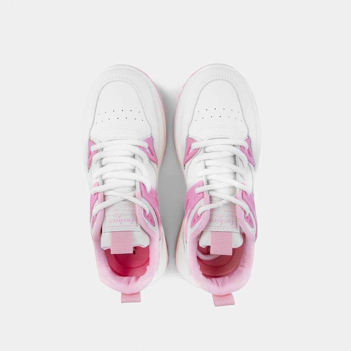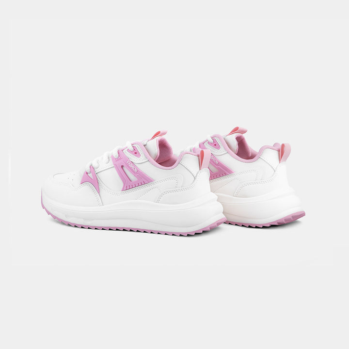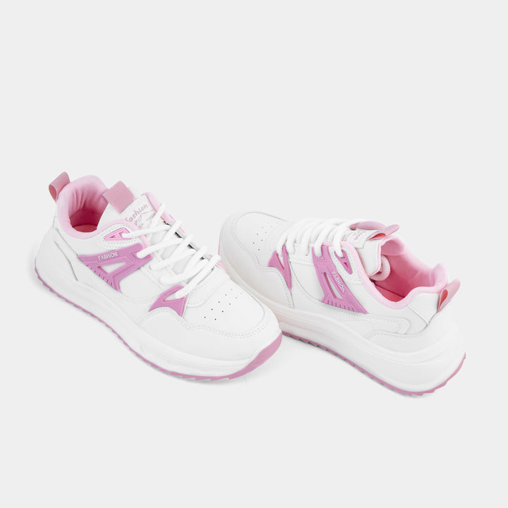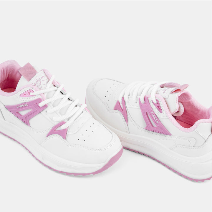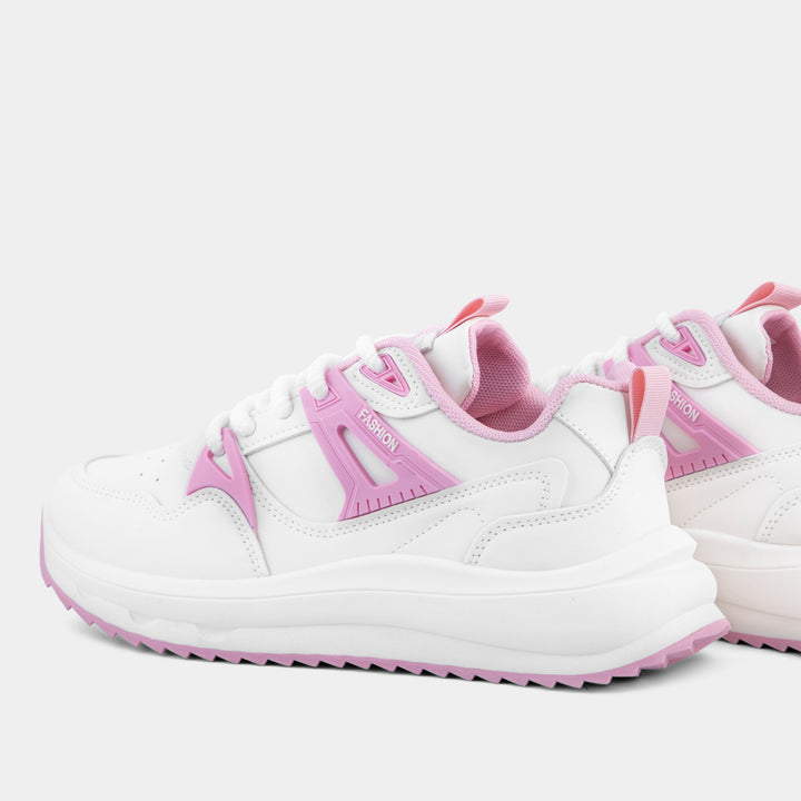 These stylish white and pink sneakers are a perfect blend of sporty and fashionable. The design features a smooth white upper with bold, geometric pink overlays and classic white laces. A thick, white sculpted sole provides a modern, elevated look, while the padded collar and cushioned sole ensure all-day comfort.
