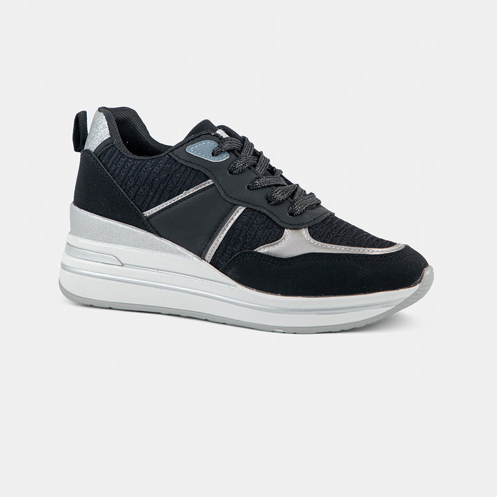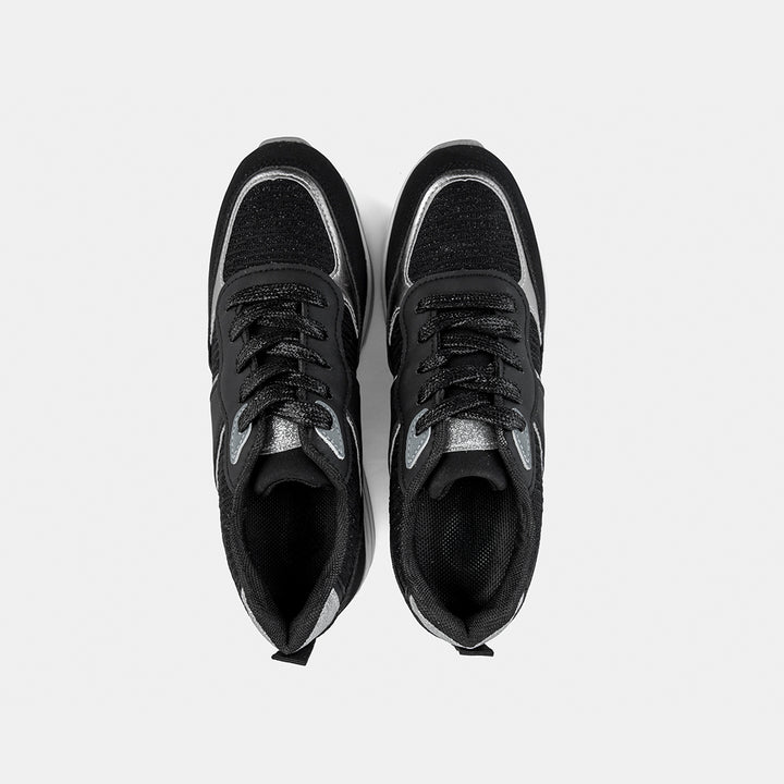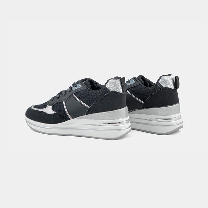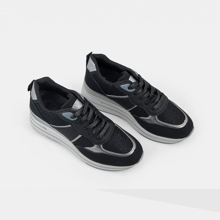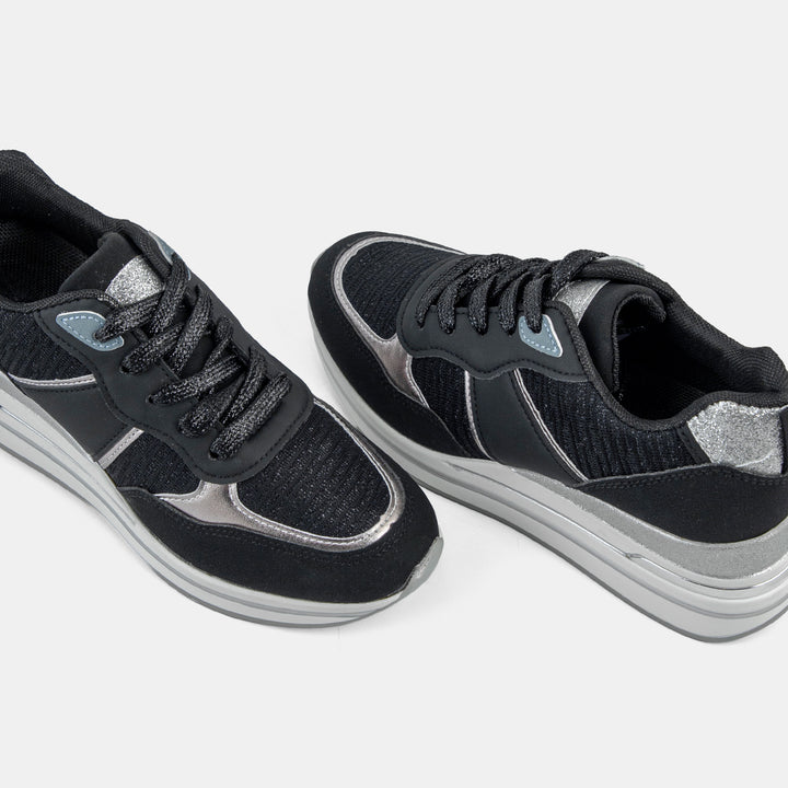 A sleek and modern black and silver sneaker, perfect for adding a touch of glamour to your athletic or casual look. This shoe features a combination of black mesh and textured materials, with striking metallic silver accents and a clean white platform sole. Ideal for a night out, urban exploration, or elevating your streetwear style. Shop this fashionable and eye-catching women's sneaker.