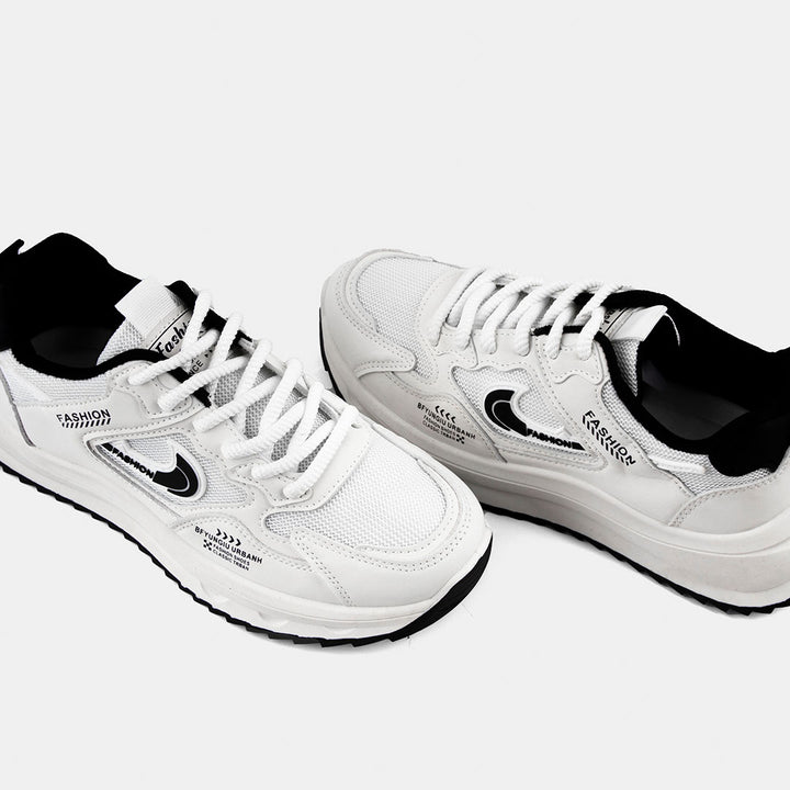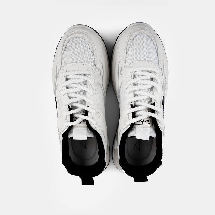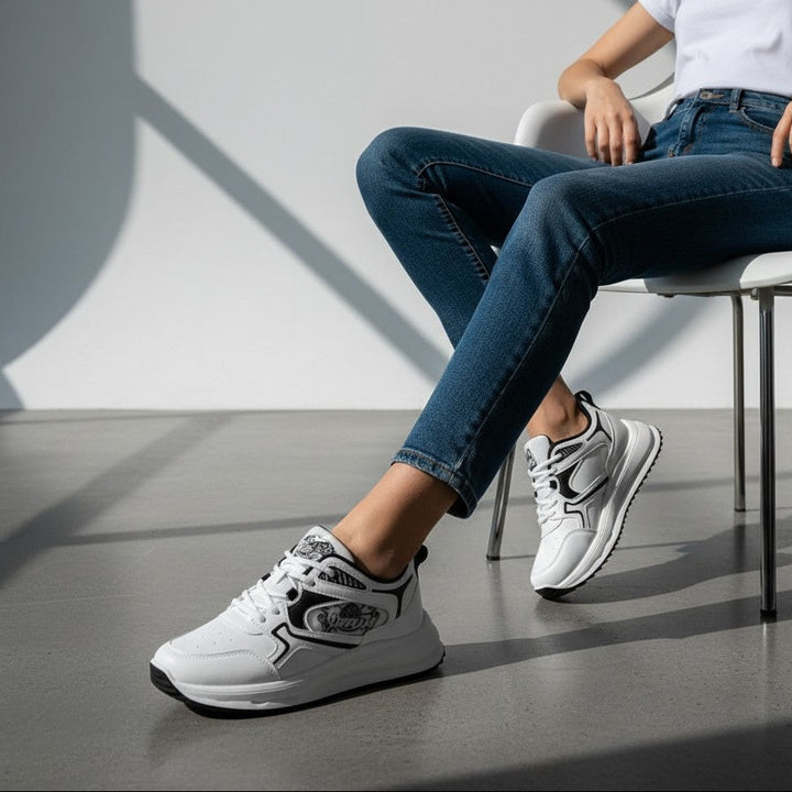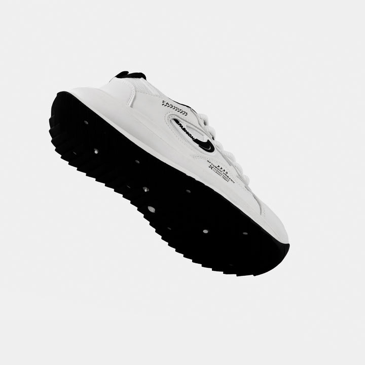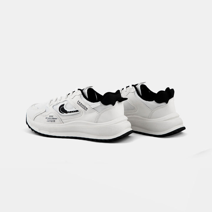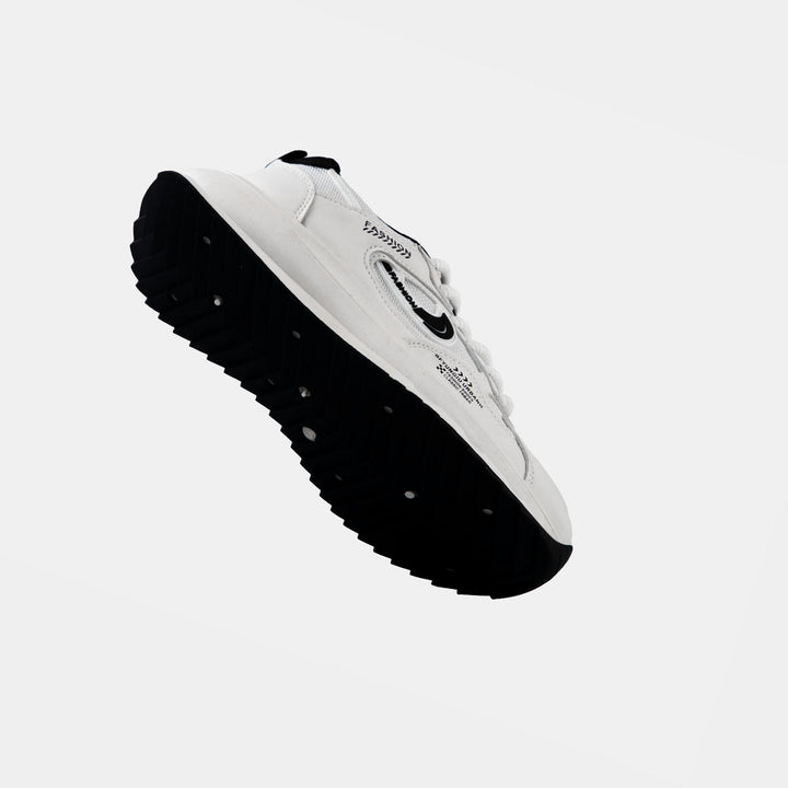 A modern and eye-catching sneaker that perfectly blends style and comfort. This shoe features a clean white base with bold navy overlays and a distinctive star-shaped cutout on the side, adding a unique touch. Its fashionable chunky sole provides excellent support for all-day wear, while the secure lace-up closure ensures a snug fit. This is the ideal footwear for anyone looking to elevate their streetwear style with a standout piece.