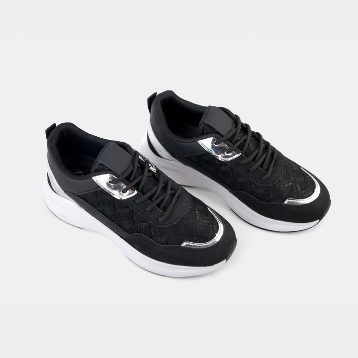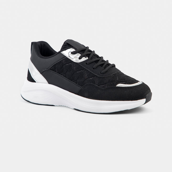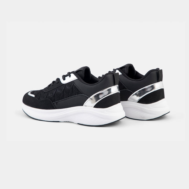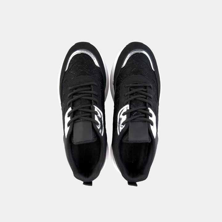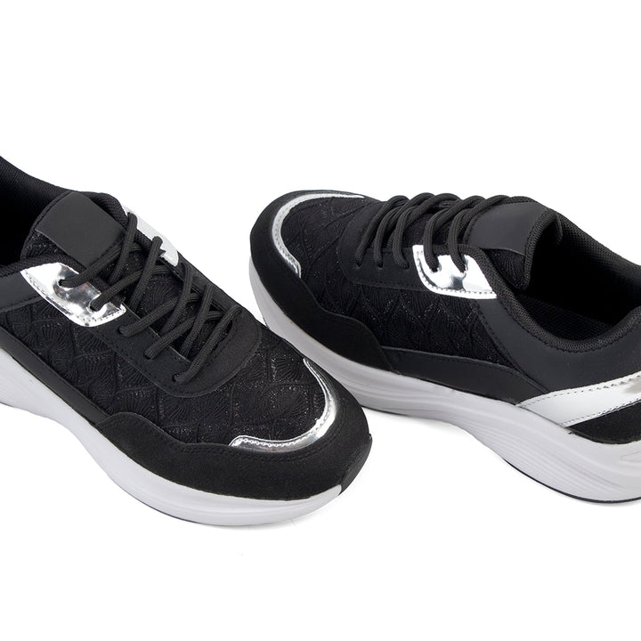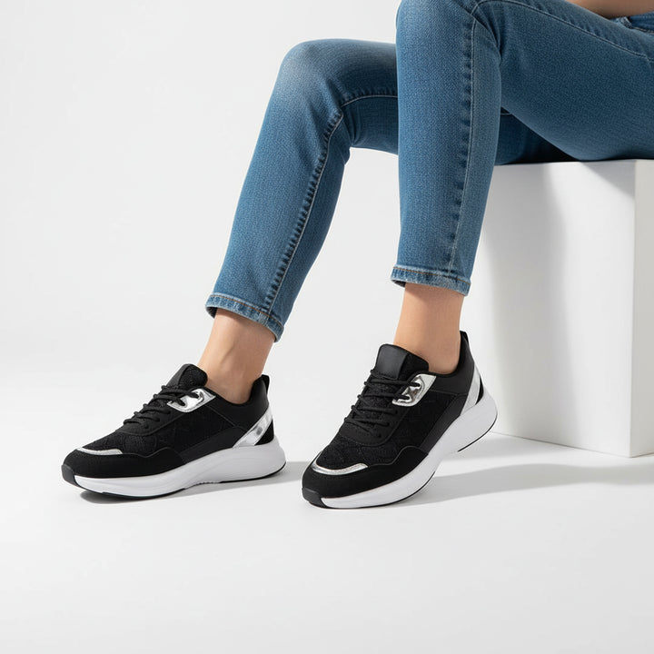 Elevate your look with these stylish and functional sneakers. Featuring a modern, mixed-material design and a supportive sole, they offer a comfortable and chic option for any occasion. The subtle, repeating pattern and metallic accents provide a touch of sophistication, making these shoes a versatile addition to your everyday wardrobe. Perfect for those who want to blend fashion with all-day comfort.