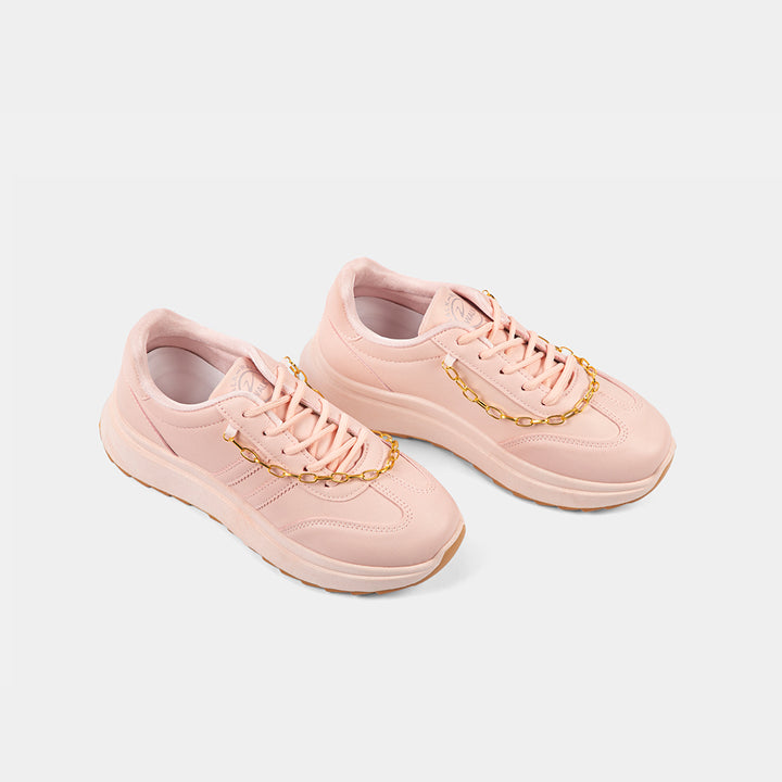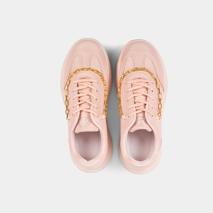 Crafted from premium quality material in a delightful soft pink hue, these sneakers offer a stylish aesthetic with a comfortable feel. The eye-catching gold-toned chain embellishment gracefully draped across the laces adds an exquisite touch of glamour and uniqueness, ensuring you stand out from the crowd.