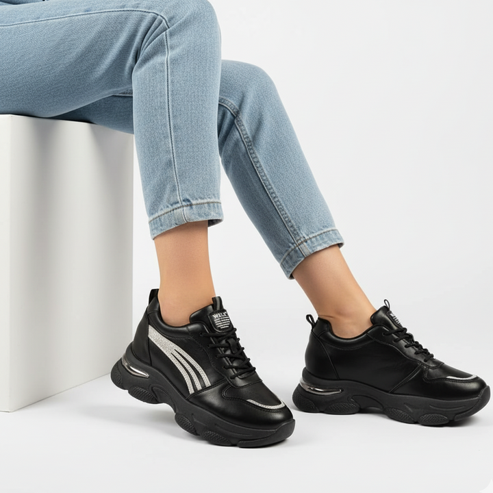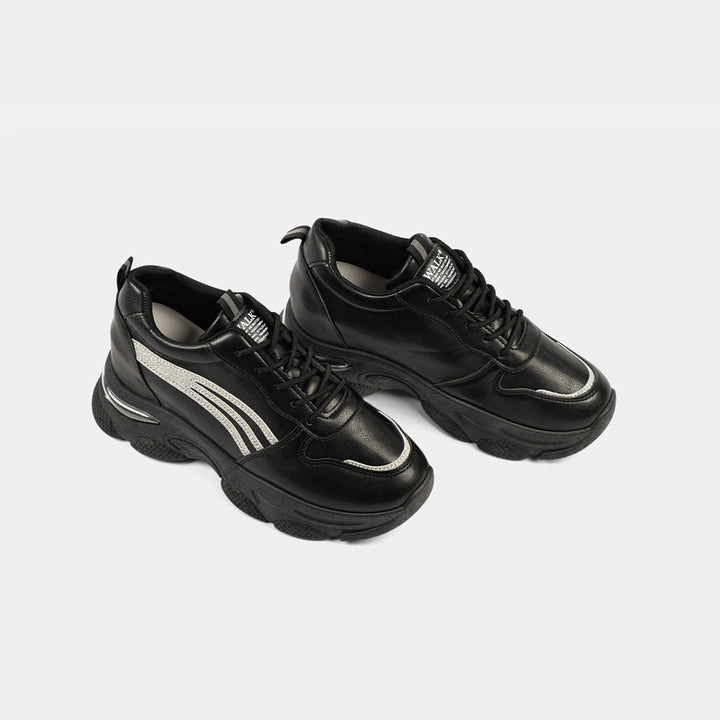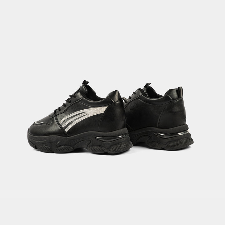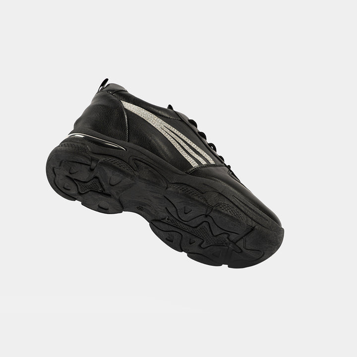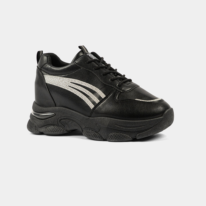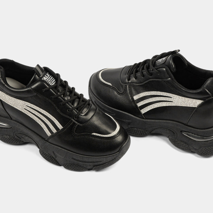 Elevate your footwear collection with these bold, fashion-forward platform sneakers. They feature a chunky, durable outsole that provides excellent stability and a subtle height boost, perfect for a commanding street-style look. The smooth, leather-like upper is beautifully contrasted by a double stripe of glittering accents, adding a touch of undeniable glamour to the classic silhouette. Designed for those who demand both statement style and all-day comfort, these versatile shoes effortlessly transition from daytime errands to evening outings. Experience the perfect fusion of trendy design, superior support, and eye-catching detail.