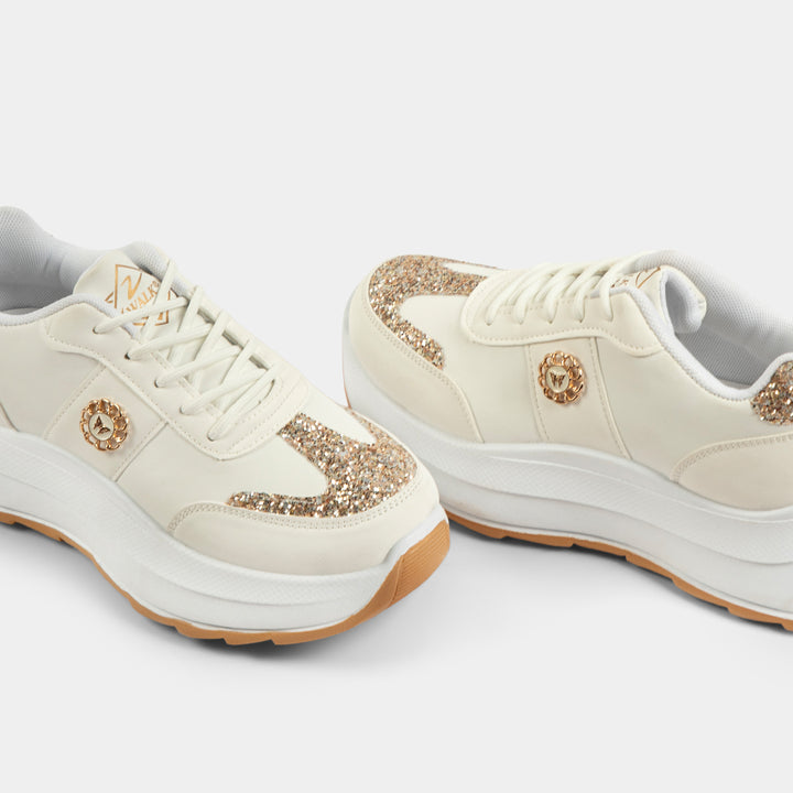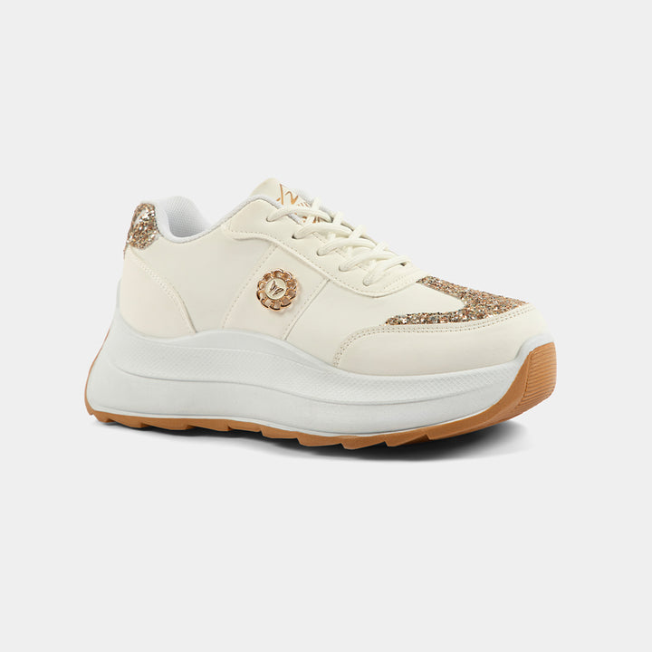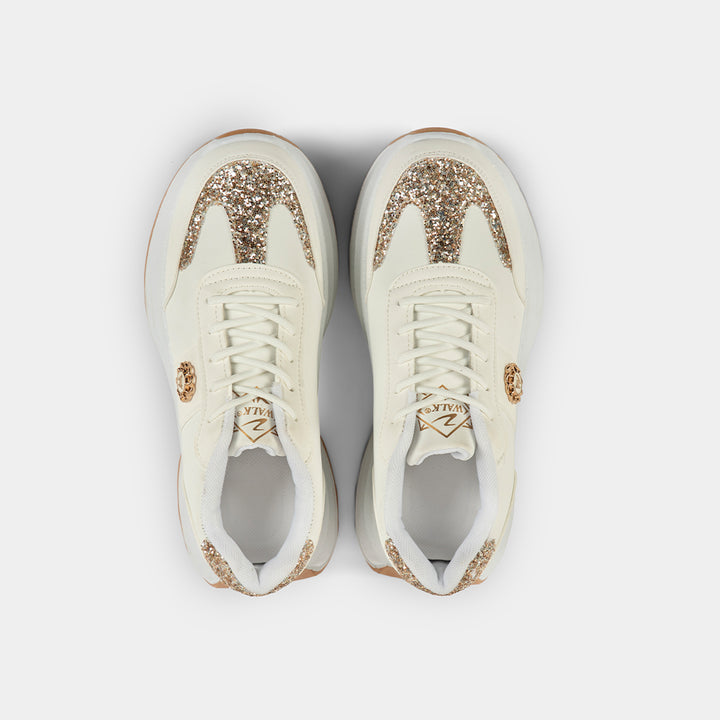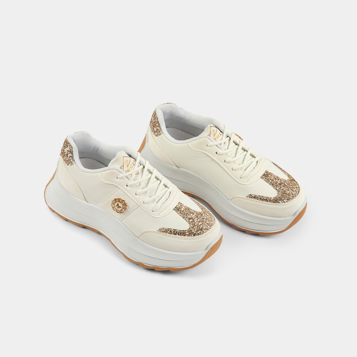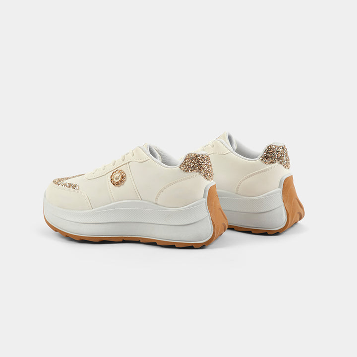 Step up your style with the latest Chunky Platform Sneakers for Women in Pakistan, featuring dazzling Gold Glitter accents! Available in two stunning versions—a classic and bold Black & Gold or a versatile, chic Beige/Off-White & Gold—these shoes are the ultimate statement footwear. The on-trend high sole design not only gives you a fashionable lift but is engineered for all-day comfort, making them perfect for university, casual outings, or adding a 'wow' factor to your party wear (dholki or birthday events). Embrace the viral chunky shoe trend with confidence and sparkle. Get your pair of these must-have stylish ladies sneakers today with Cash on Delivery (COD) all over Pakistan for a risk-free purchase!