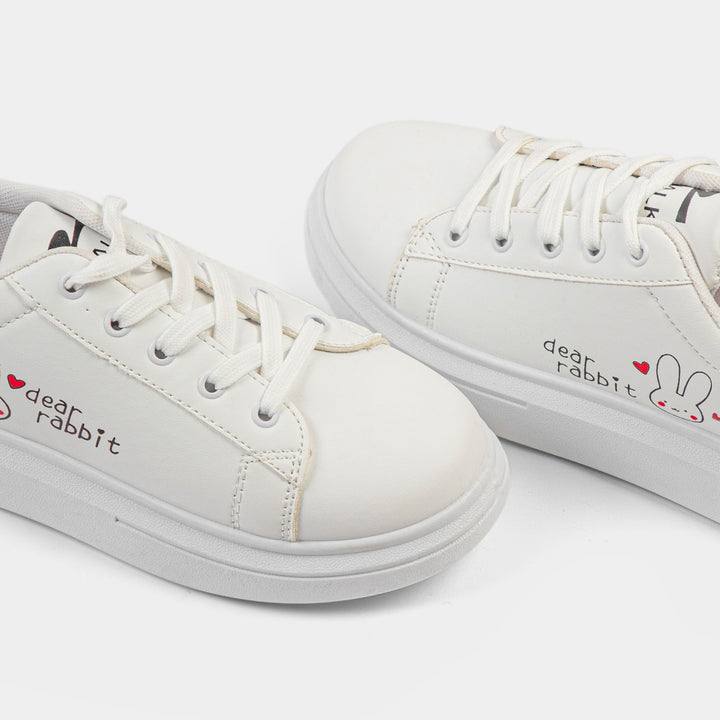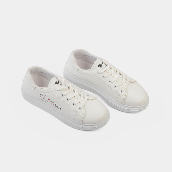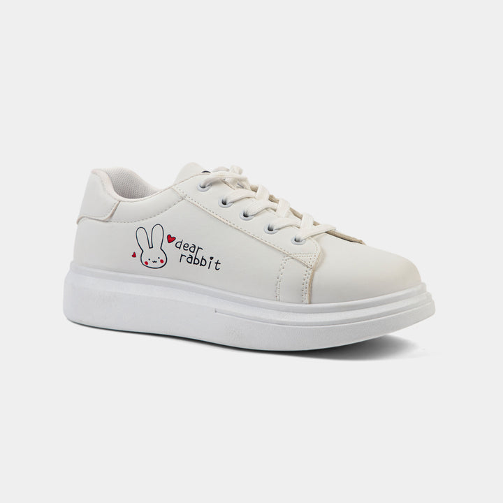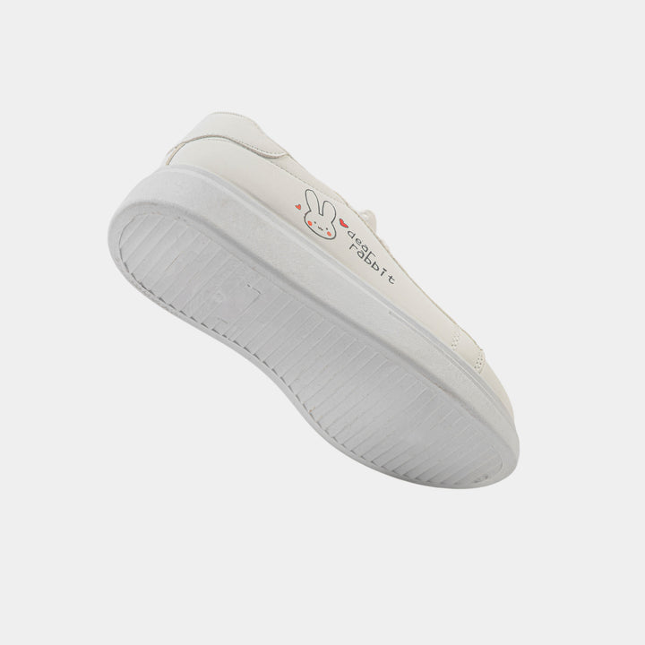 Add a touch of playful charm to your wardrobe with our delightful White 'Dear Rabbit' Graphic Sneakers, the perfect blend of cute design and casual comfort for the Pakistani market. These clean, classic white low-top sneakers are a versatile staple, featuring a smooth faux leather upper and a slightly elevated, comfortable platform sole. The standout detail is the adorable embroidered bunny (Dear Rabbit) graphic with red heart accents on the side, making them a fun and trendy choice for students and young women. Ideal for daily wear, college, casual outings, or pairing with jeans and eastern wear like shalwar kameez for a contemporary look, these lace-up trainers are lightweight and easy to wear all day. Get your hands on these must-have cute graphic shoes and enjoy the perfect mix of simplicity and personality. Shop these popular flat white sneakers online in Pakistan today and hop into style!