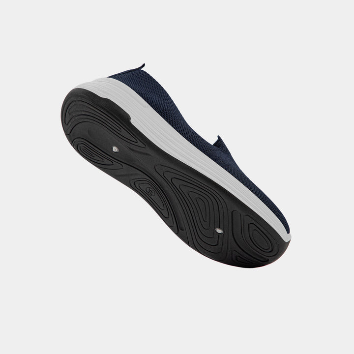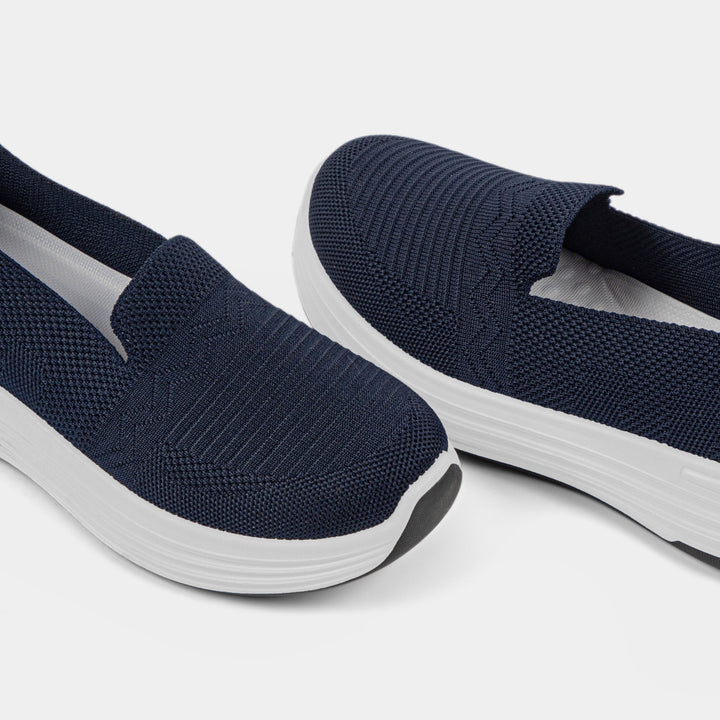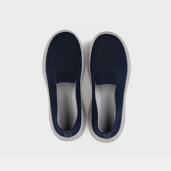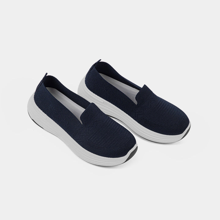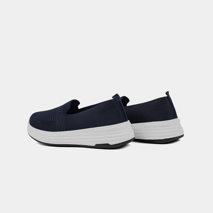 Discover ultimate comfort and streamlined style with our practical Navy Blue Knitted Slip-On Sneakers, the ideal solution for comfortable, everyday wear across Pakistan. These sleek trainers feature a seamless, highly breathable knitted upper in a deep navy hue, ensuring your feet stay cool and comfortable while offering a versatile look that pairs easily with both Western and Eastern wear. The convenient slip-on design means quick and easy wear—perfect for busy women and those who prioritize convenience! Built on a supportive, lightweight white wedged sole with a black rubber base, these shoes provide cushioned steps and a subtle height increase without compromising stability. They are the ideal choice for walking, running errands, or simply enjoying supreme comfort at home. Grab this effortlessly chic and practical Navy knitted footwear online in Pakistan today!