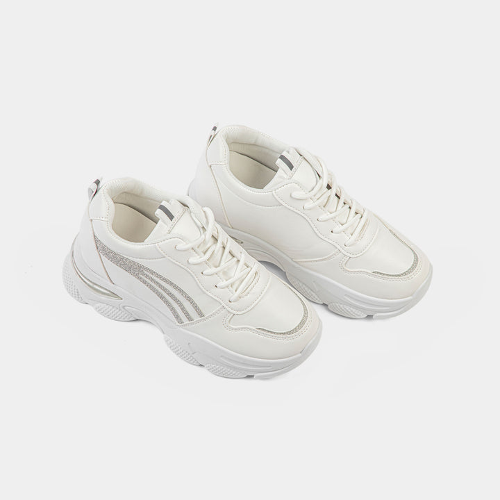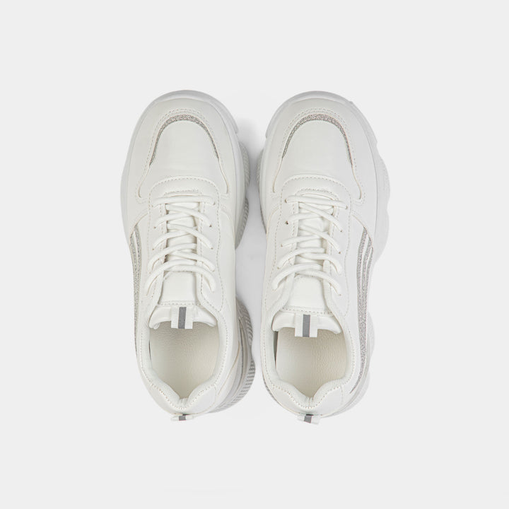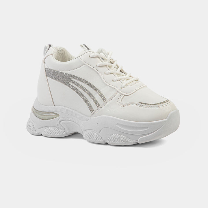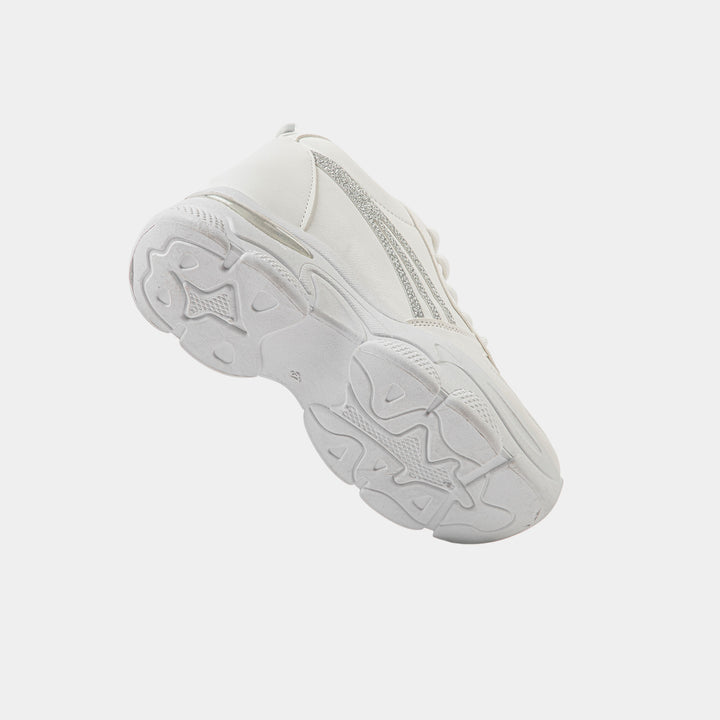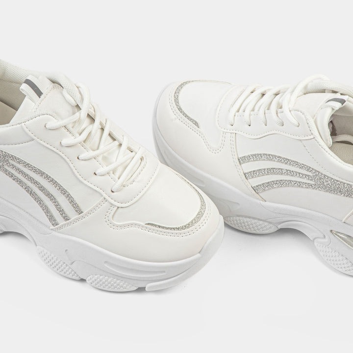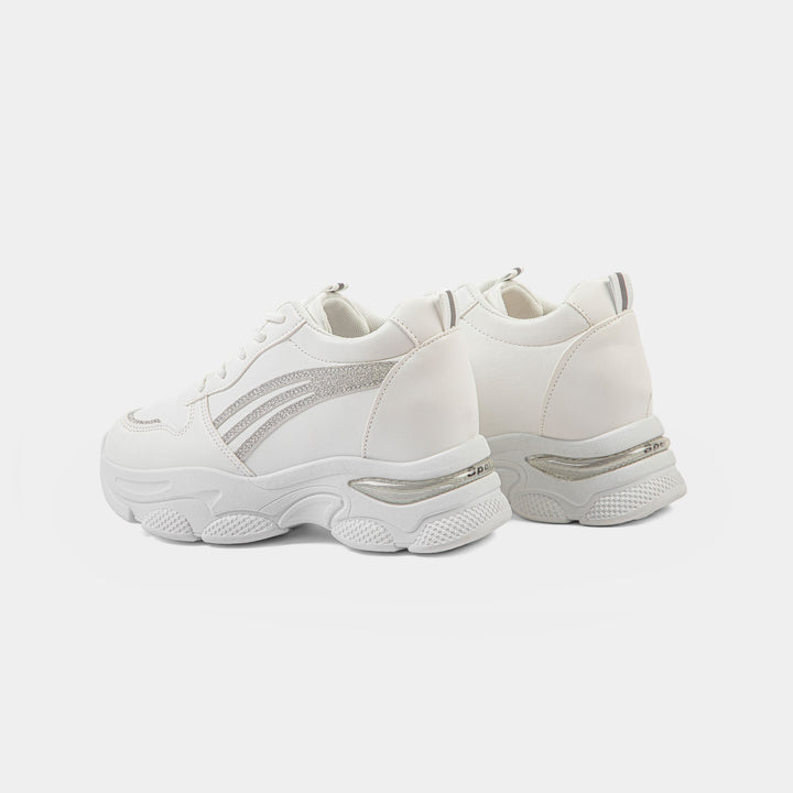 Step into the spotlight with our dazzling White Chunky Platform Sneakers, the perfect footwear to instantly elevate your casual look and tap into the latest global fashion trends popular across Pakistan. These sleek trainers feature a clean white faux leather upper, contrasted beautifully by three dynamic silver glitter stripes on the side and a reflective silver detail on the heel, adding a touch of glamour and shine. Built on a distinctly rugged and oversized chunky sole, this shoe offers both impressive height and exceptional, cushioned comfort, making it a comfortable choice for long days. The subtle silver metallic detail on the heel adds a futuristic touch. Ideal for university students, casual gatherings, or adding an edgy flair to your favorite jeans and tops, these white platform shoes are a must-have for every trendy wardrobe. Shop these standout silver accent trainers online in Pakistan and enjoy walking tall with style!