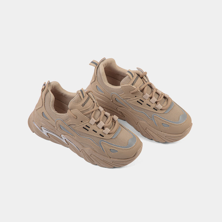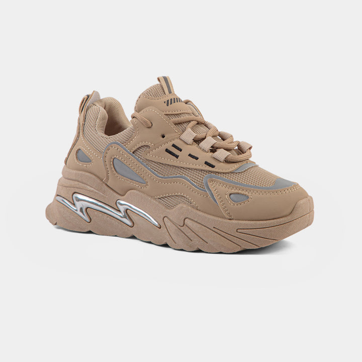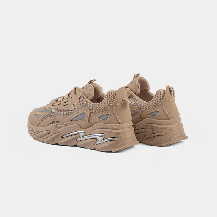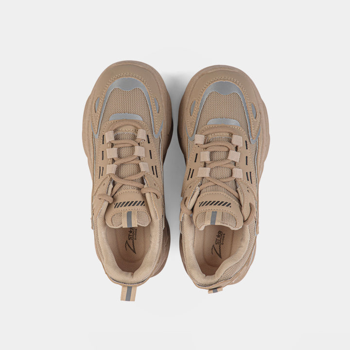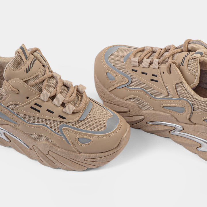 Women's Monochromatic Beige Chunky Sneaker | Tan Metallic Platform Trainer - This trendy, aggressive sneaker features a uniform tan/nude upper with mesh and synthetic overlays. The chunky platform sole is highlighted by a striking metallic silver lightning bolt detail, perfect for bold streetwear looks.