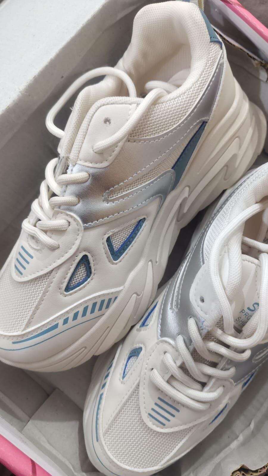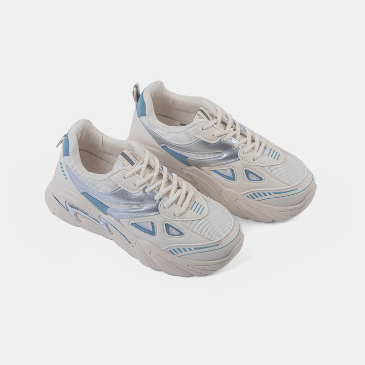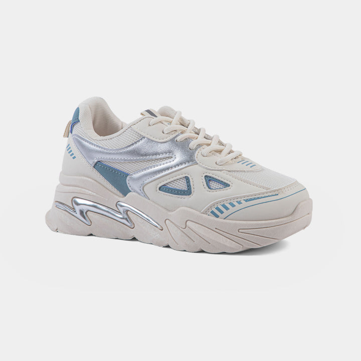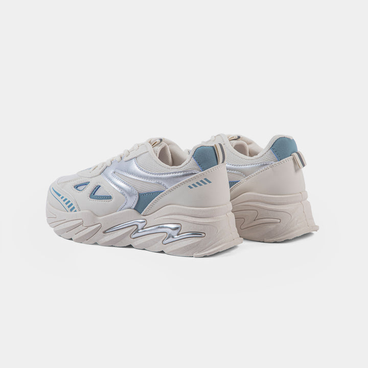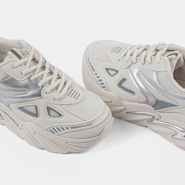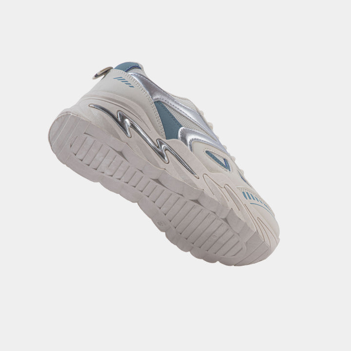 Women's Cream Chunky Sneaker with Silver and Blue Accents | Retro Platform Trainer - Make a statement with this trendy sneaker featuring a neutral cream base, eye-catching metallic silver panels, and subtle blue details. The aggressive, elevated sole includes a signature silver lightning bolt detail for bold streetwear style.