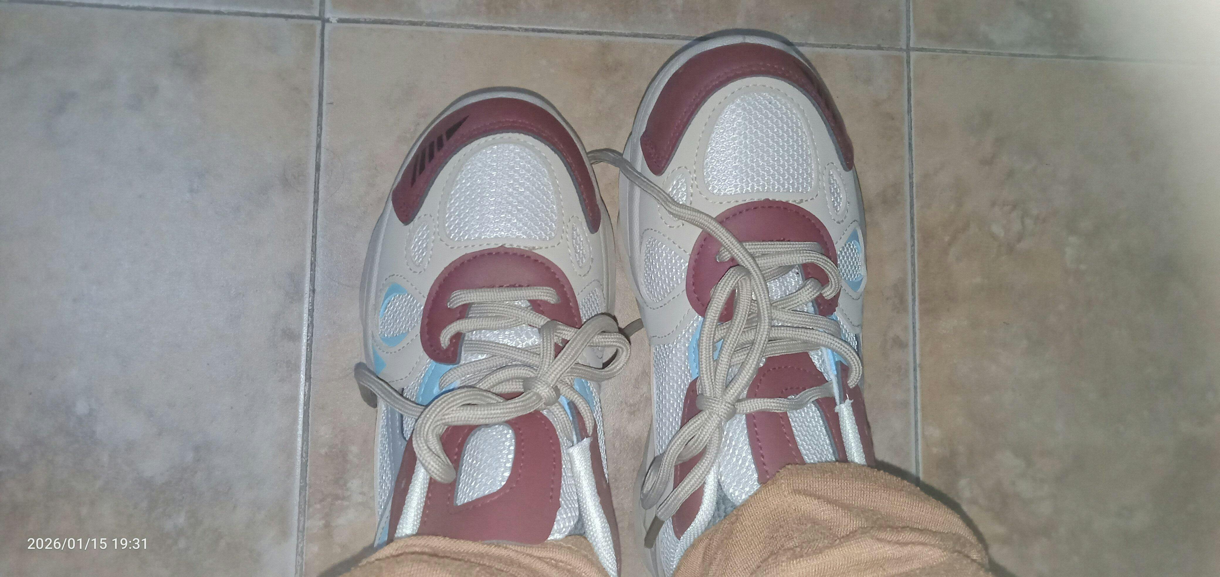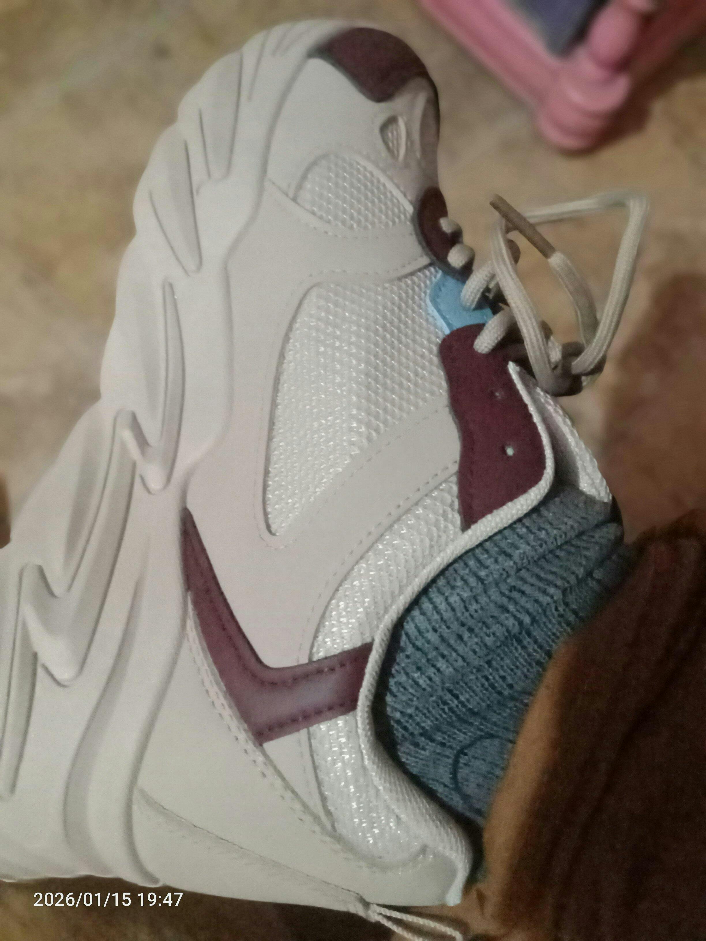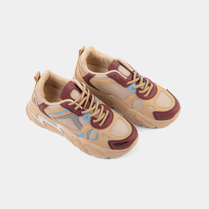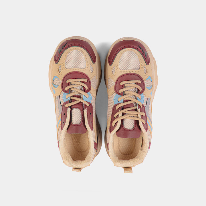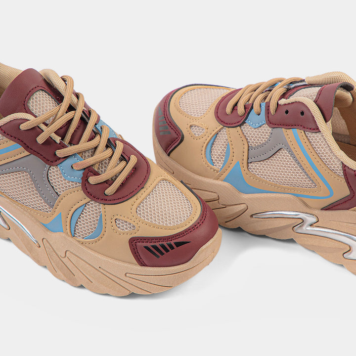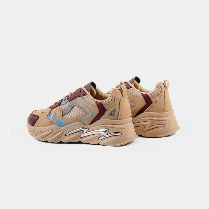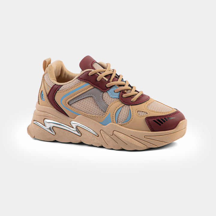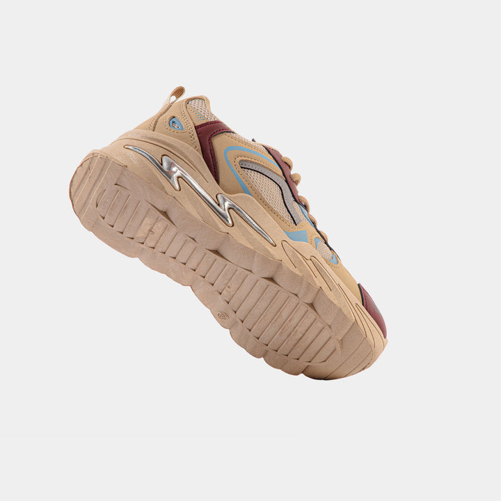 Women's Tan Multi-Color Chunky Trainer | Burgundy & Blue Fashion Sneaker - This bold, Y2K-style sneaker features a mixed-material upper in neutral tan, deep burgundy, and bright blue accents. Finished with an aggressive sole and a striking metallic silver lightning bolt detail for ultimate streetwear style.