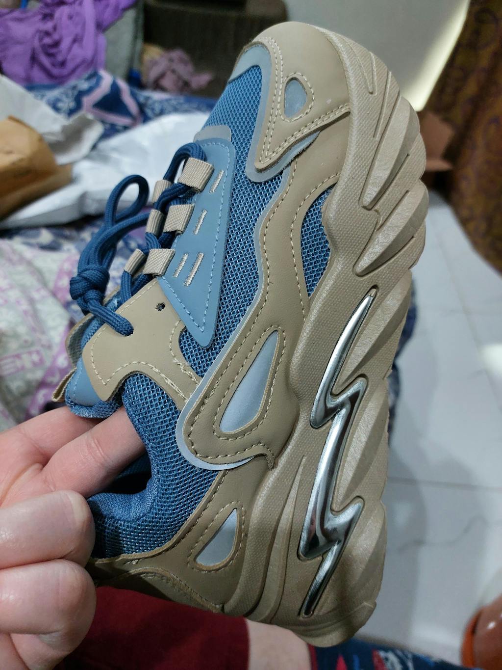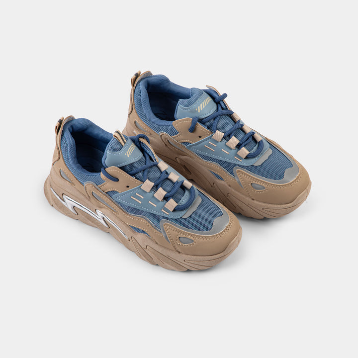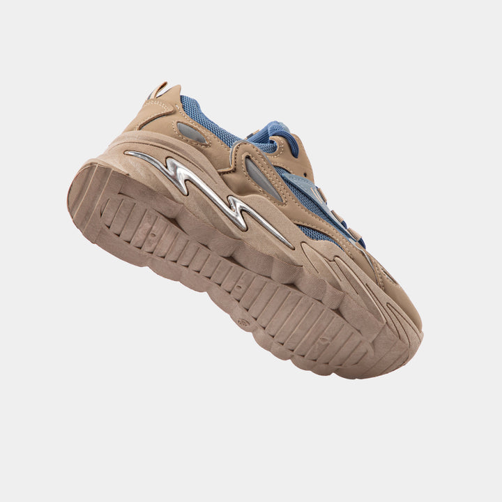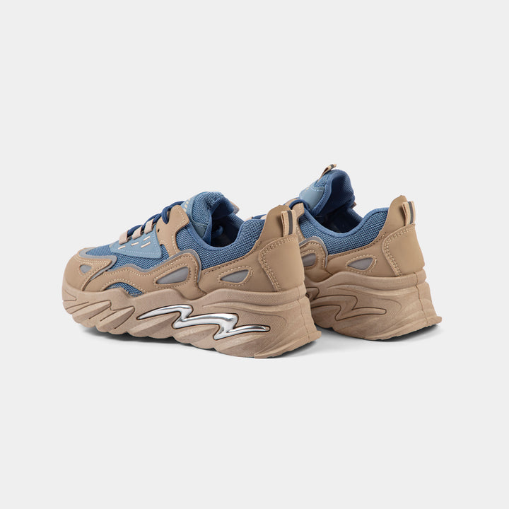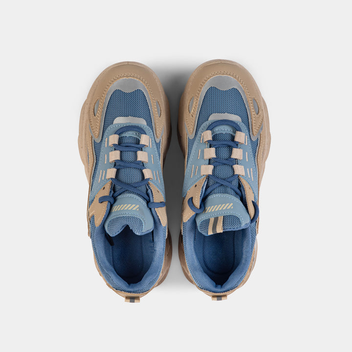 Women's Blue and Tan Chunky Trainer | Multi-Tone Streetwear Sneaker - This bold, modern sneaker combines cool blue mesh with neutral tan leather overlays and a rugged, elevated sole. Features a striking metallic silver lightning bolt detail, perfect for eye-catching, trend-forward casual style.