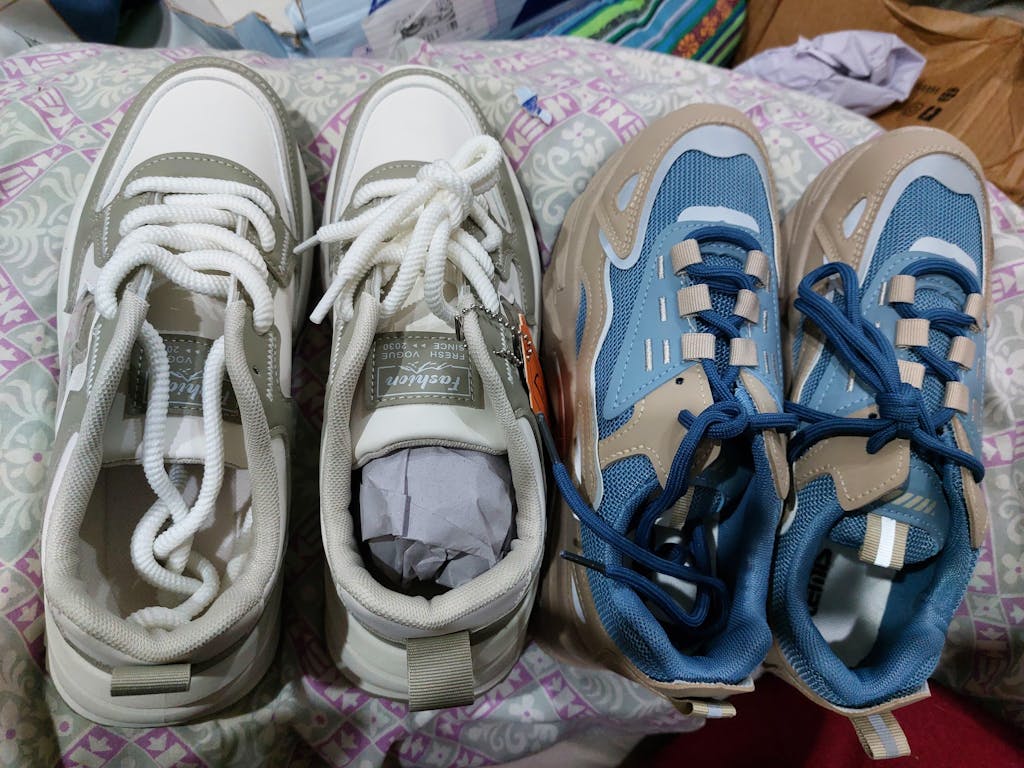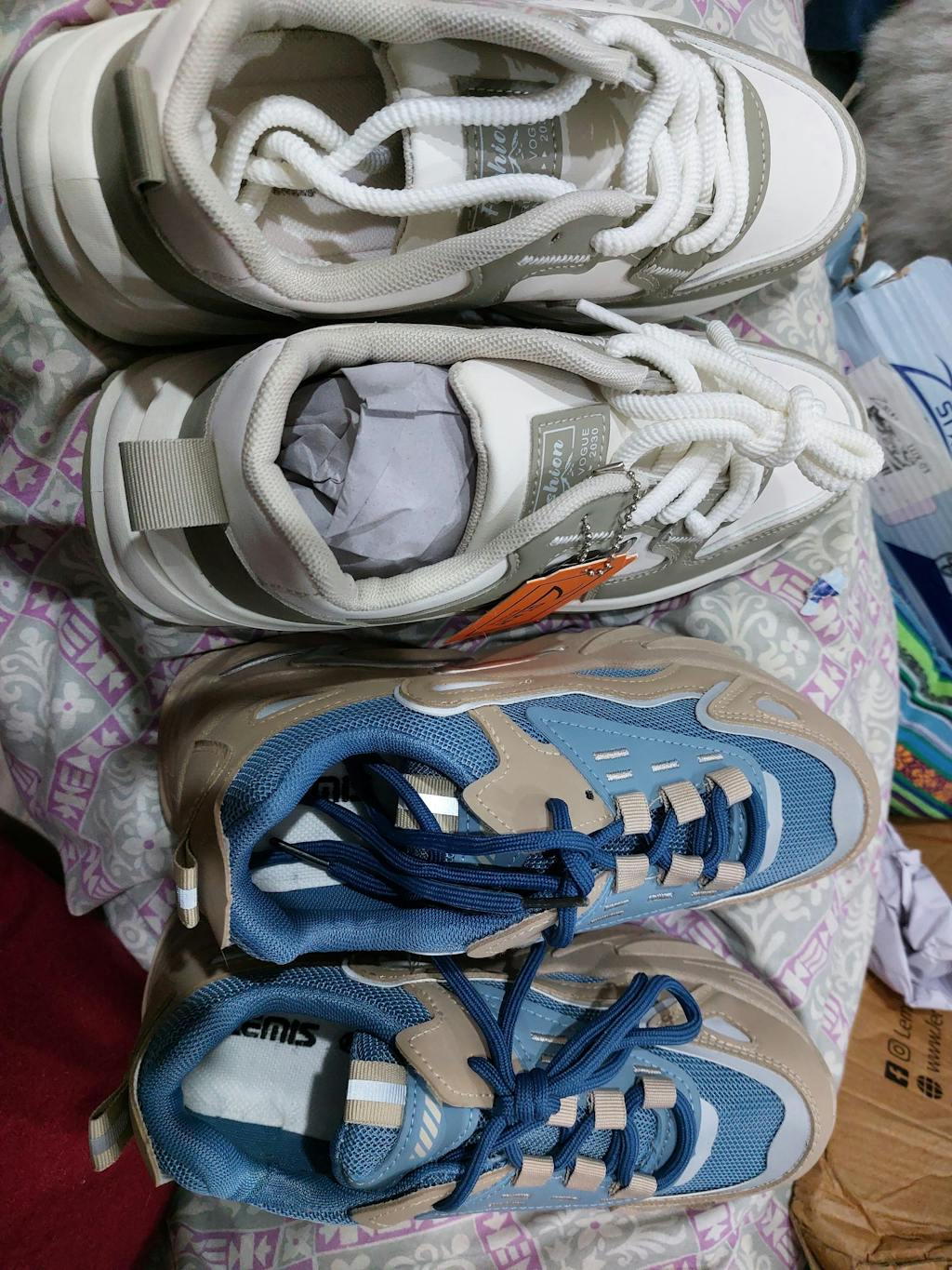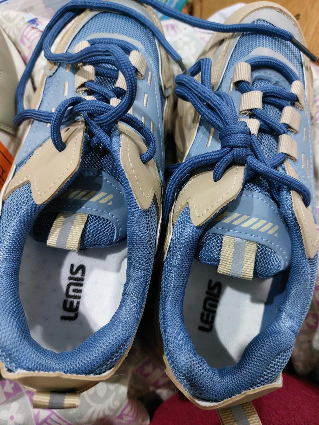 Women's Blue and Tan Chunky Trainer | Multi-Tone Streetwear Sneaker - This bold, modern sneaker combines cool blue mesh with neutral tan leather overlays and a rugged, elevated sole. Features a striking metallic silver lightning bolt detail, perfect for eye-catching, trend-forward casual style.