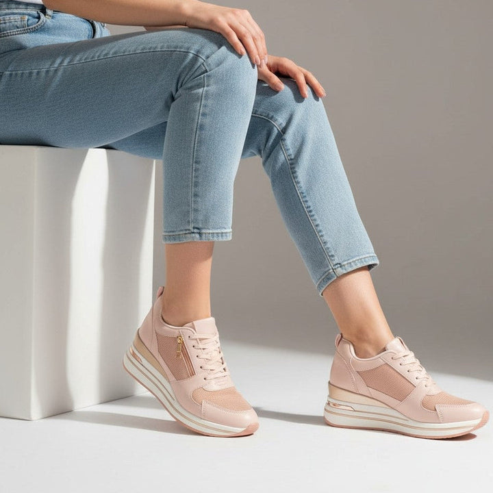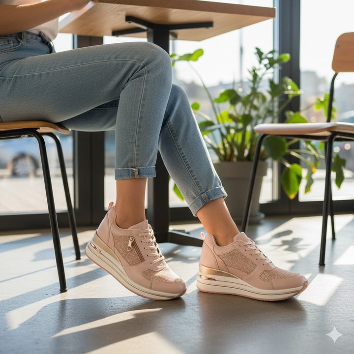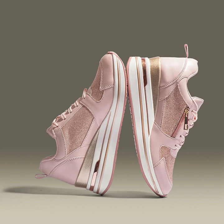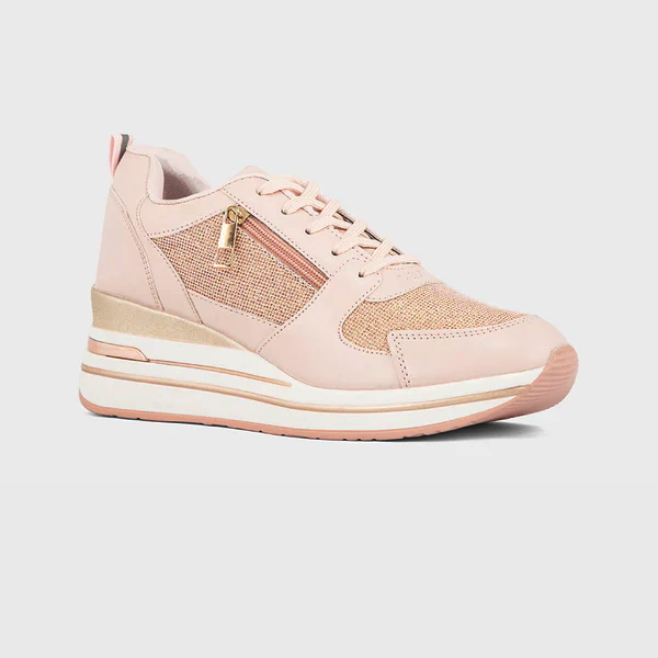 These stylish pink sneakers offer a feminine and trendy look. The chunky sole adds a touch of height and a modern edge, while the lace-up closure and side zipper ensure a secure fit. The glitter detailing adds a touch of sparkle and glamor, making them perfect for a night out or a special occasion. These sneakers are comfortable and stylish, making them a great choice for any occasion