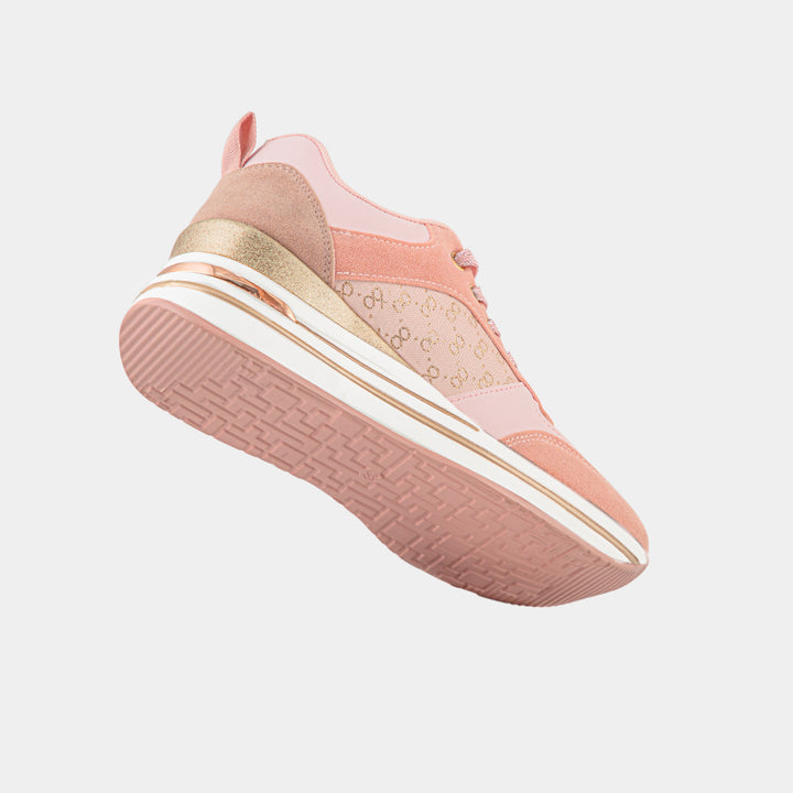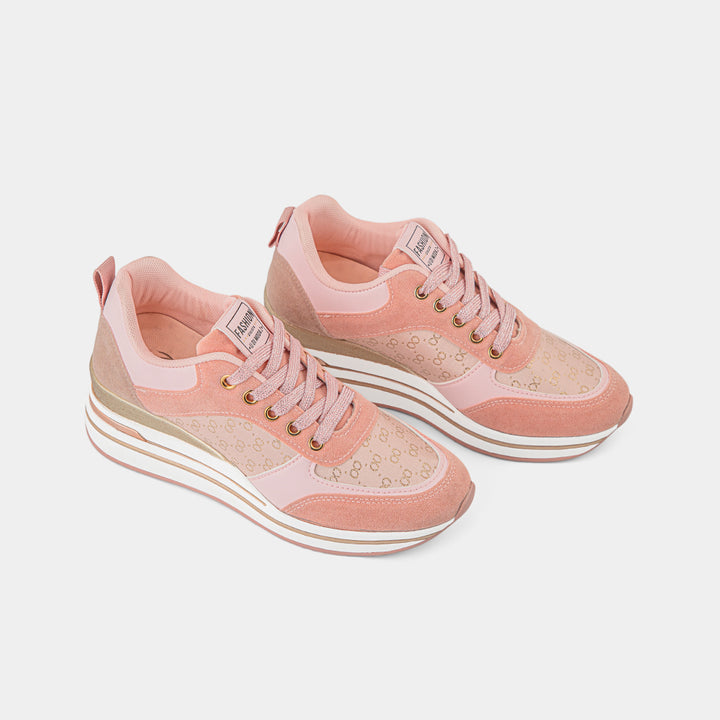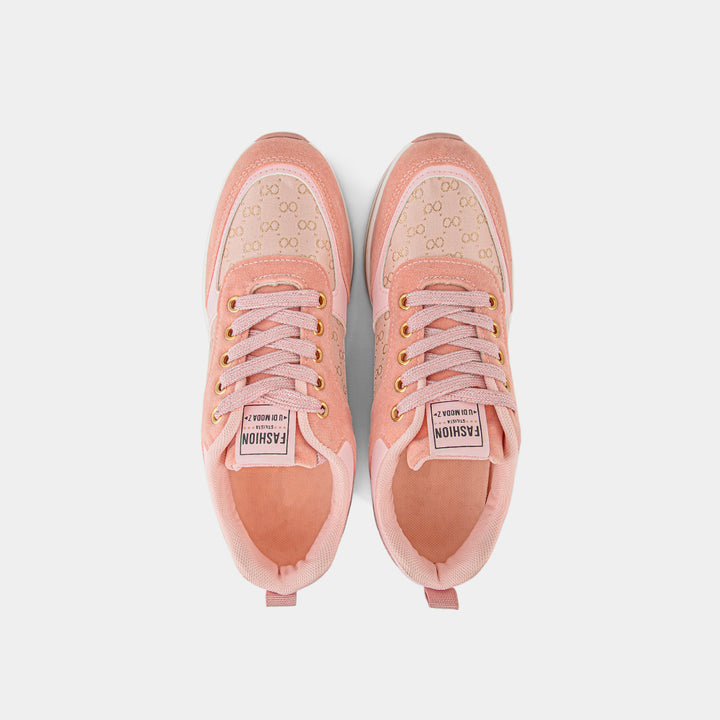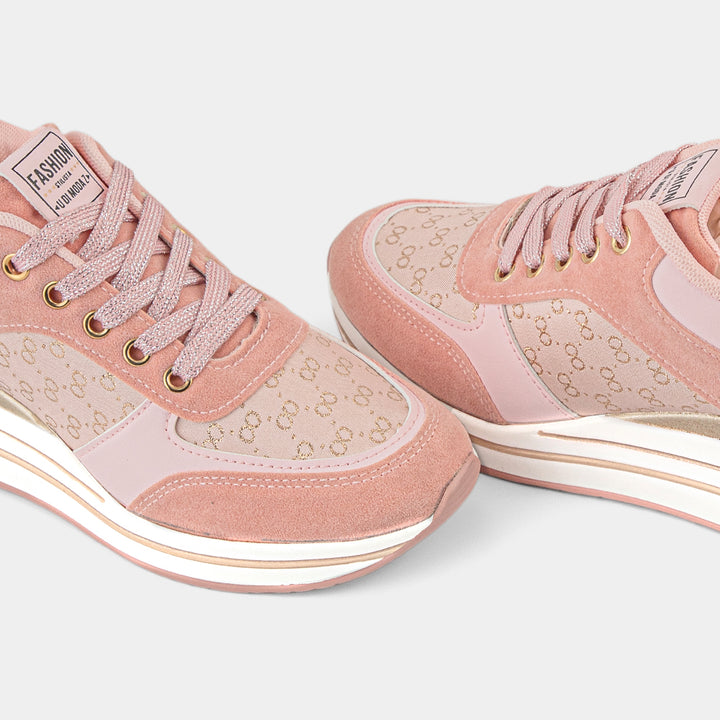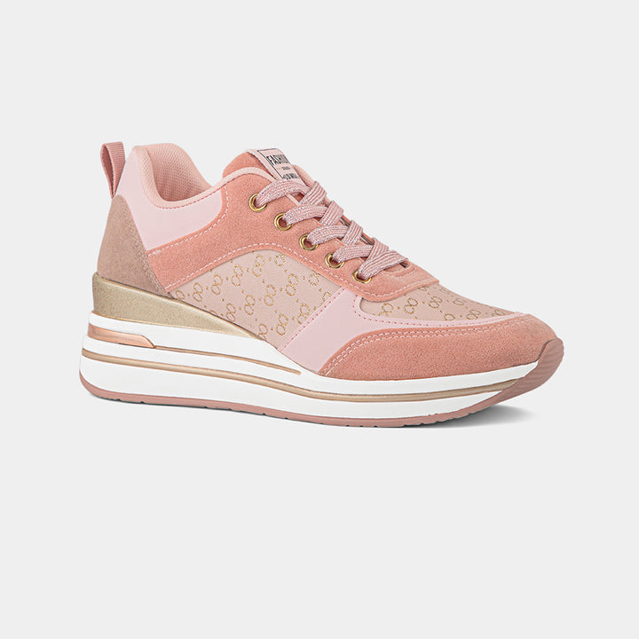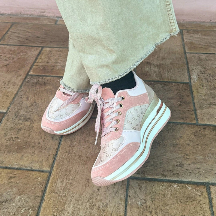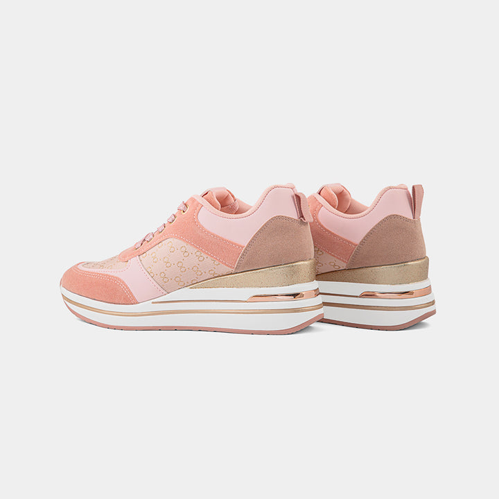 Elevate your style with our chic and sophisticated Pink & Beige Wedge Sneakers for women, a perfect blend of modern flair and luxurious comfort. These fashion-forward trainers are designed for the individual who loves a touch of height and distinctive detail. The shoe features a beautiful combination of soft pink suede-like panels and a beige textile panel adorned with a subtle, repeating "G" logo or similar monogram pattern, creating a high-end and unique visual appeal. A shimmering gold glitter textile on the sides adds a touch of glam, while the hidden wedge heel provides a flattering lift. The chunky white and gold platform sole ensures a stable and cushioned step, making them perfect for all-day wear. Complete with coordinating pink laces and a durable rubber outsole for reliable traction, these wedge sneakers are ideal for pairing with jeans, dresses, or skirts to add a stylish and contemporary finish to any casual or smart-casual ensemble. Embrace the perfect fusion of trendy design and practical elegance with these must-have trainers that will add a touch of sparkle and height to your wardrobe.